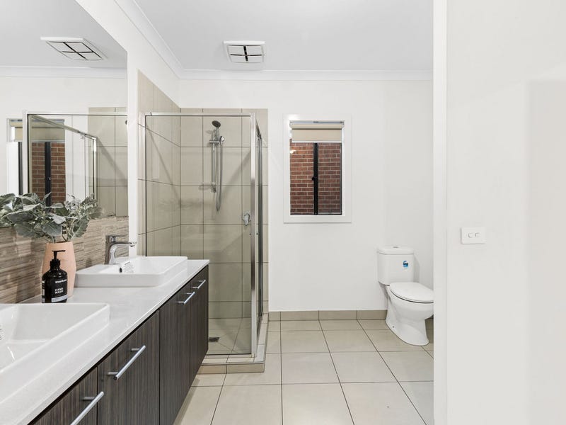 Master bedroom: Carpeted, ducted heating, windows with roller blinds, downlights, walk in robe with hanging rails, Ensuite: tiles, large mirror splash back, semi frameless shower, roller blinds, stone benchtop, extended vanity and double basin, toilet.