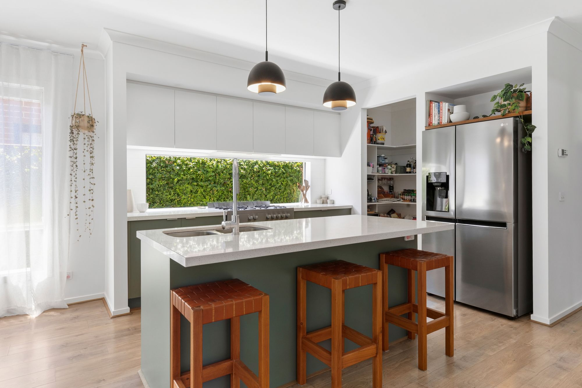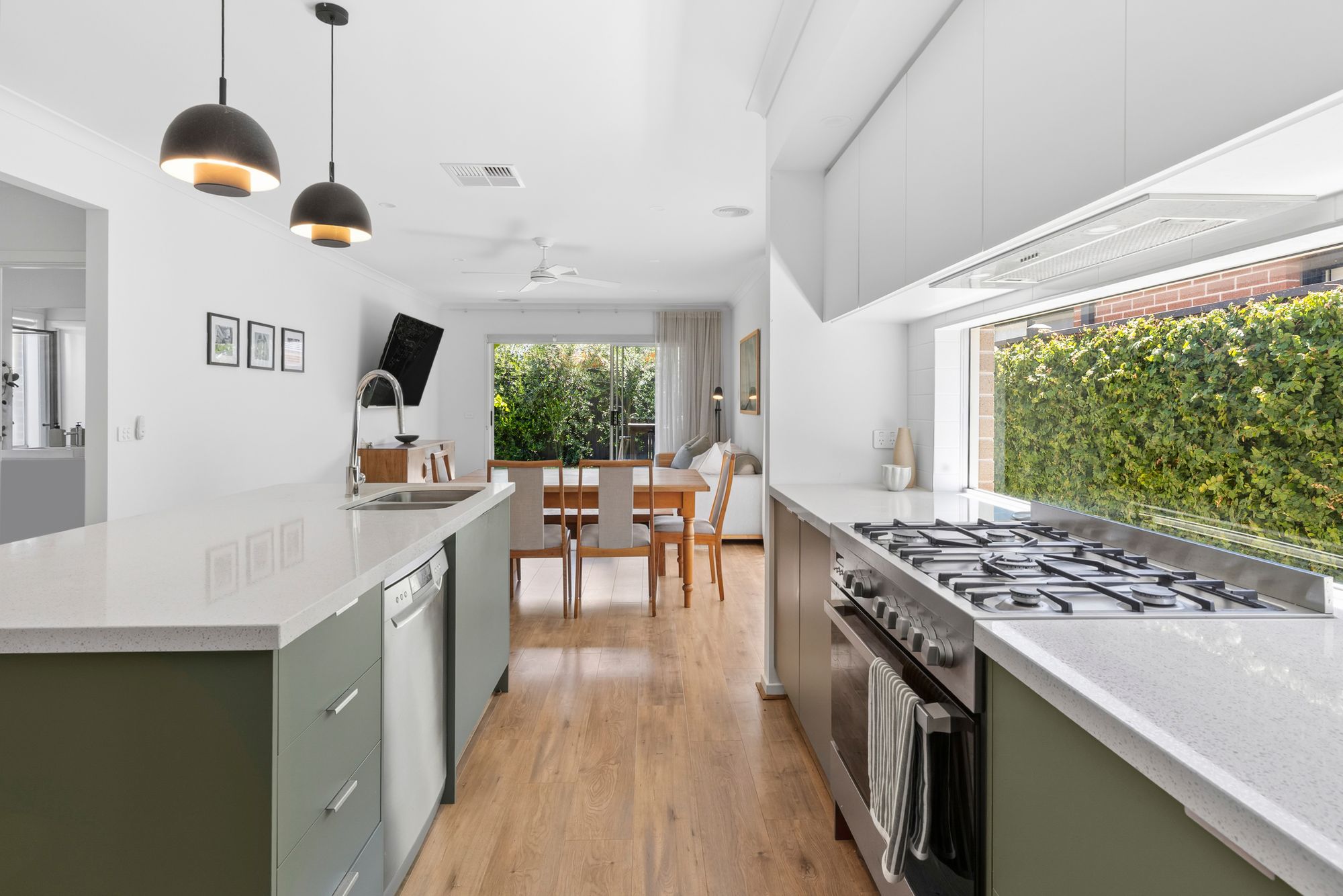 Kitchen: Raised ceiling, 40mm stone bench top, glass splashback, 900mm oven and cooktop, walk in pantry, overhead cabinetry, hidden range hood, double bowl under mount sink, pendant lighting.