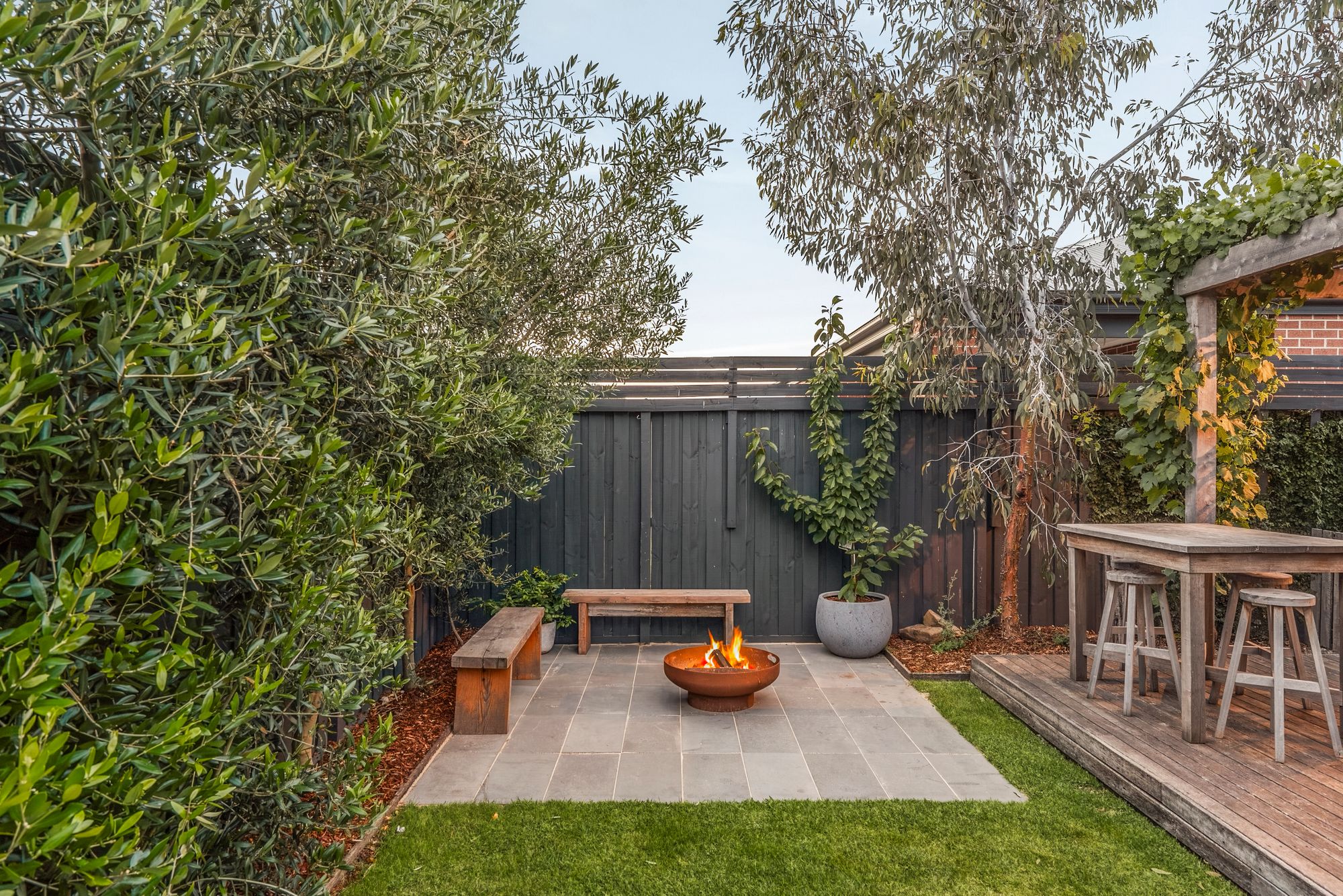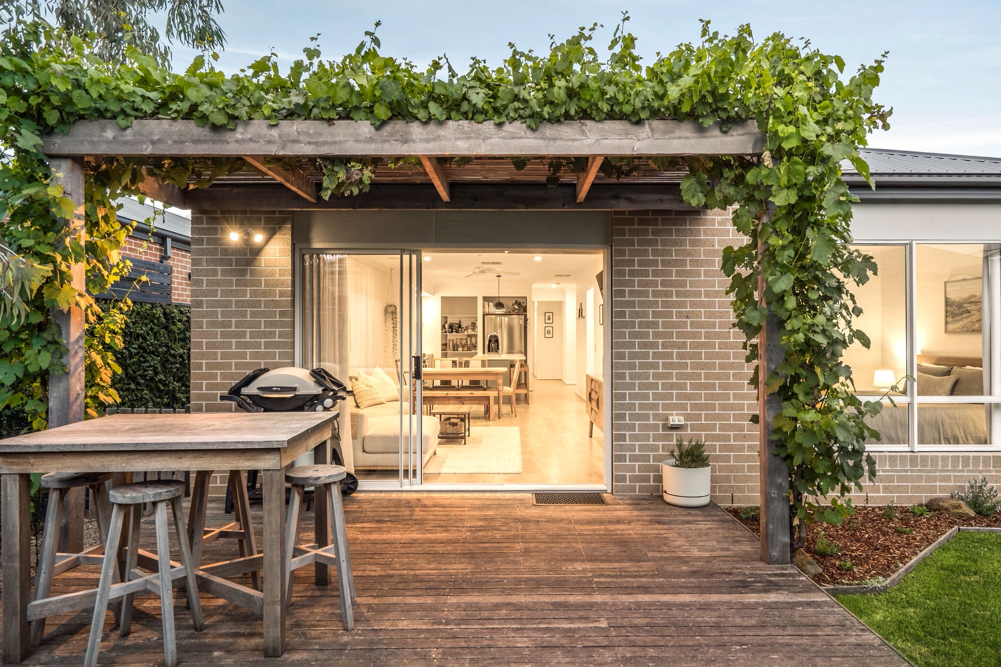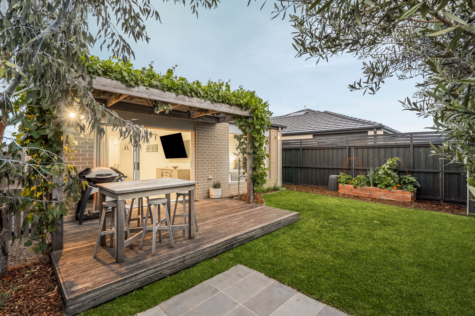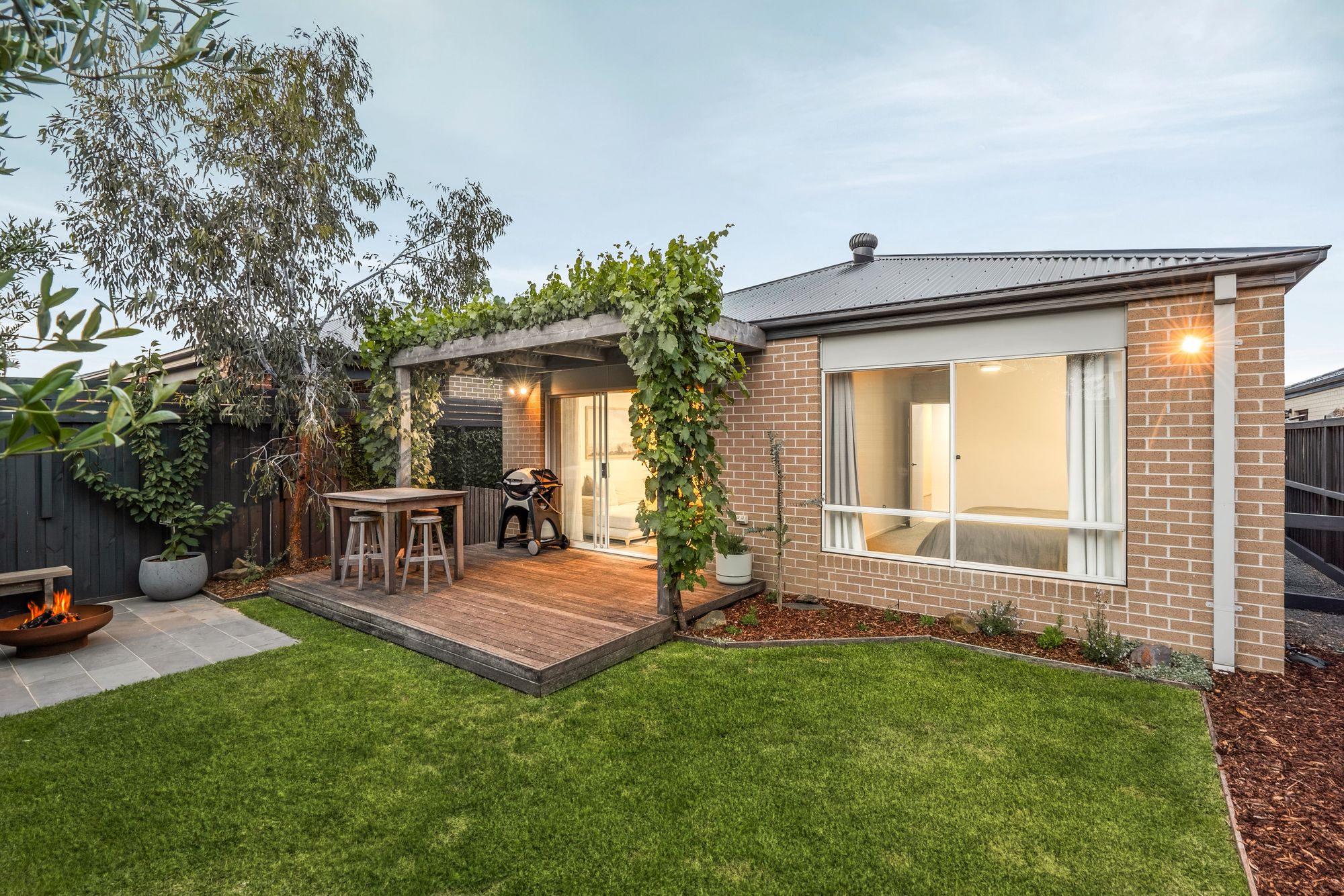 Outdoor: Pergola, decking, fire pit area, shed, veggie patch, grassed area, west facing.