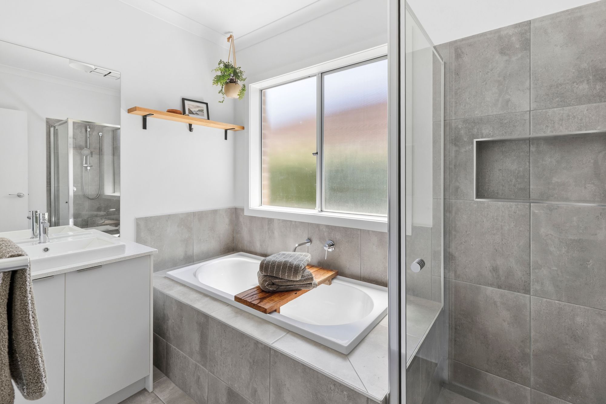 Main Bathroom: Sleek tiles, semi frameless shower, shower niche, hand held shower head, 20mm stone bench top, single vanity with ample storage, bath, frosted glass, seperate toilet.