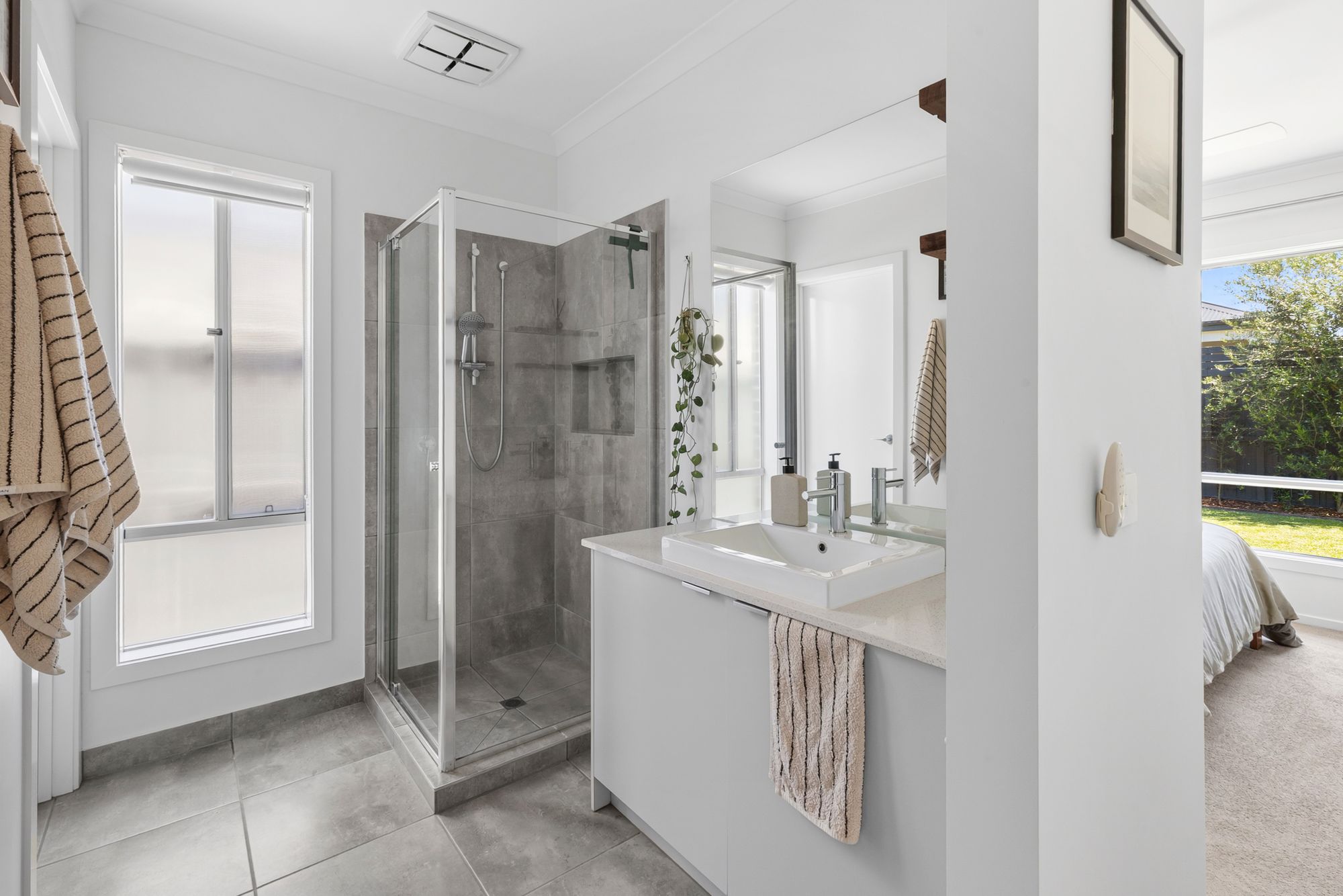 Ensuite: 20mm stone bench top, extended vanity with ample storage, semi-frameless shower with hand held shower head, shower niche, sleek tiles, seperate toilet.