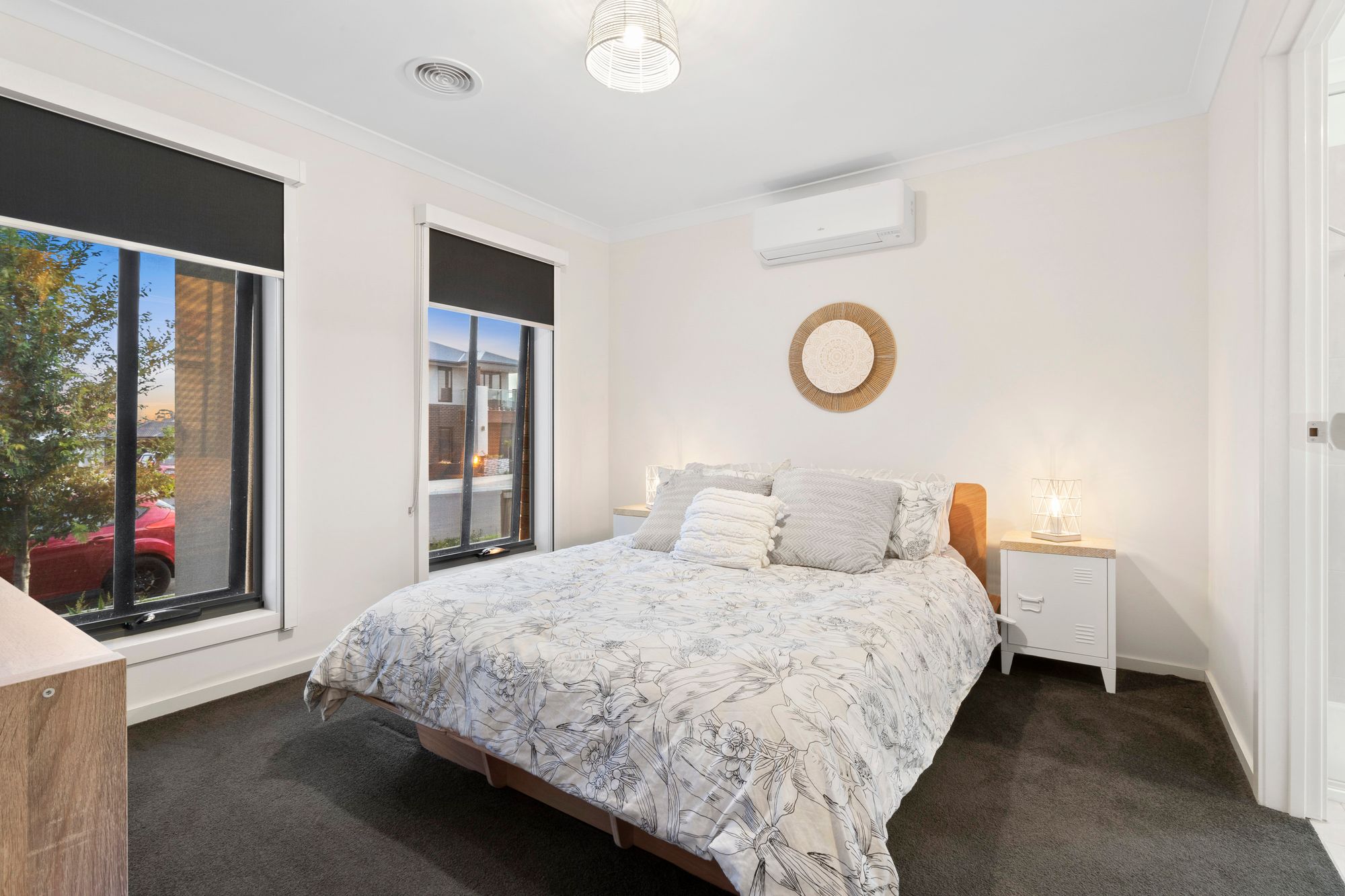 Master Bedroom: Carpet flooring, walk-in-robe, roller blinds, air conditioner, ducted heating, en suite, tiled flooring & shower, single vanity, fan & mirror splash back.