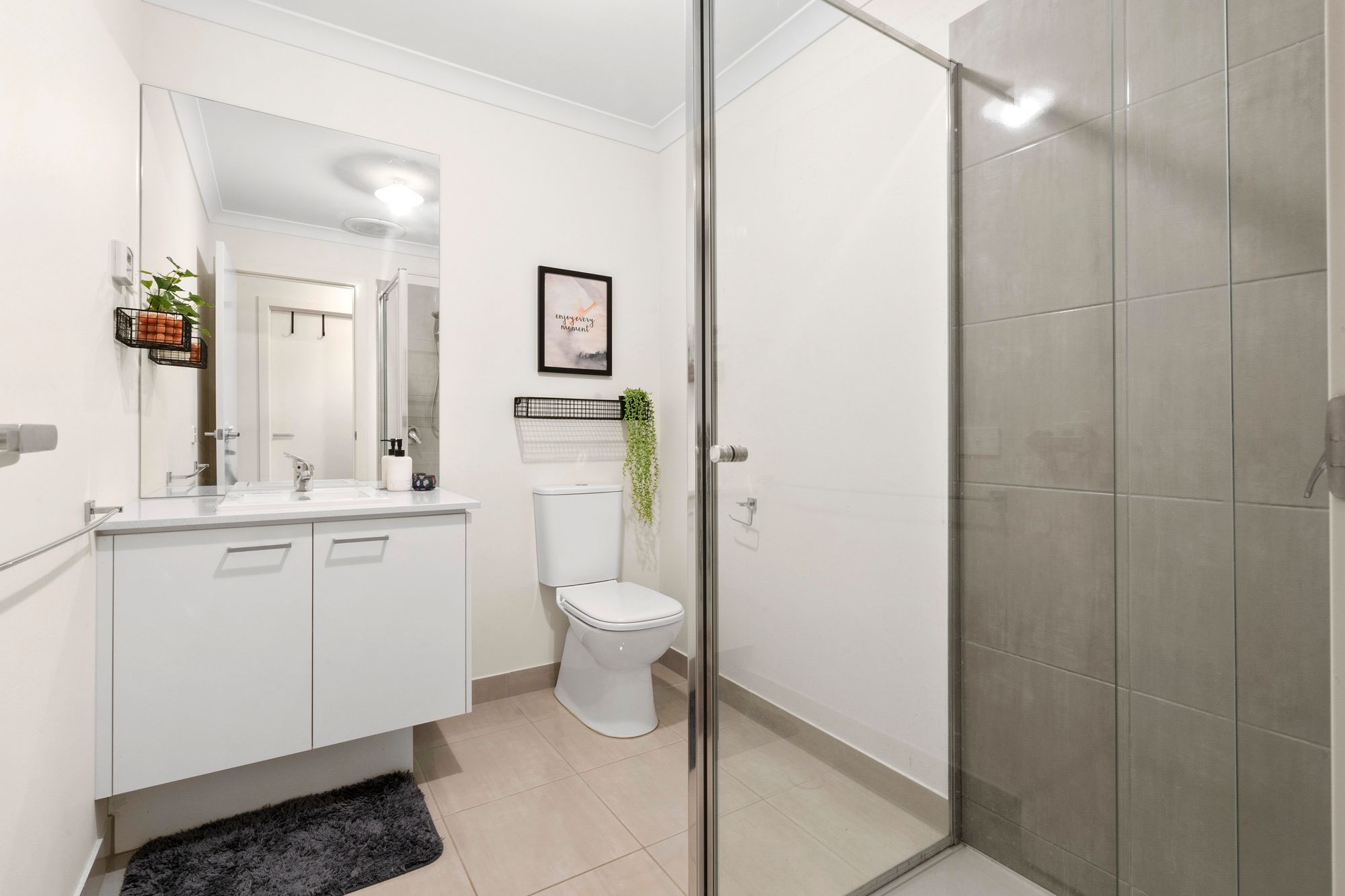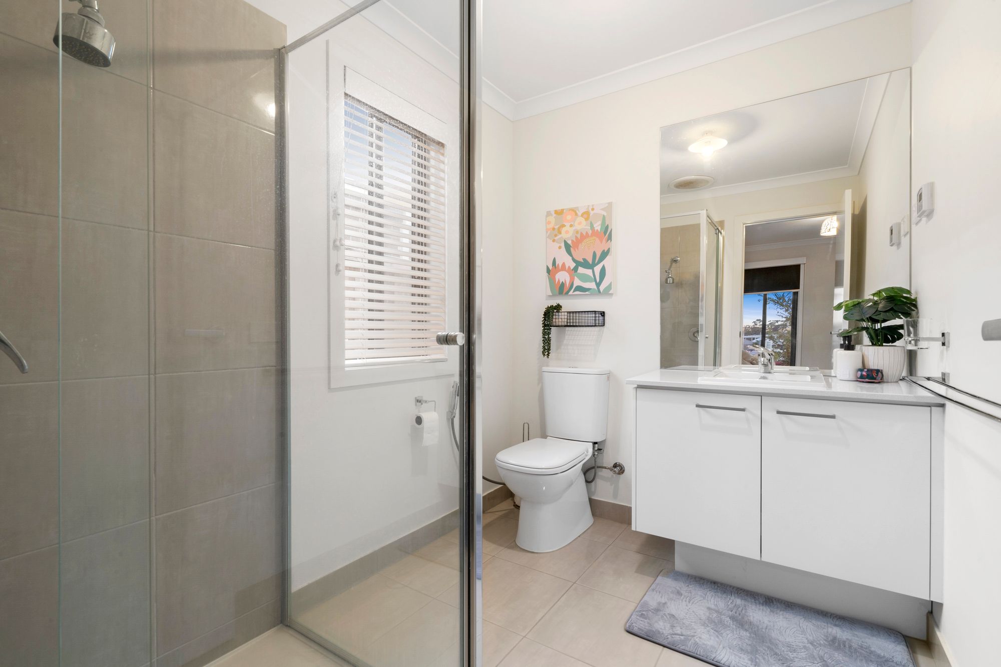 Main Bathroom: Tiled flooring & shower, hand held shower head, fan, single vanity & basin, stone bench tops, mirror splash back & cabinetry.