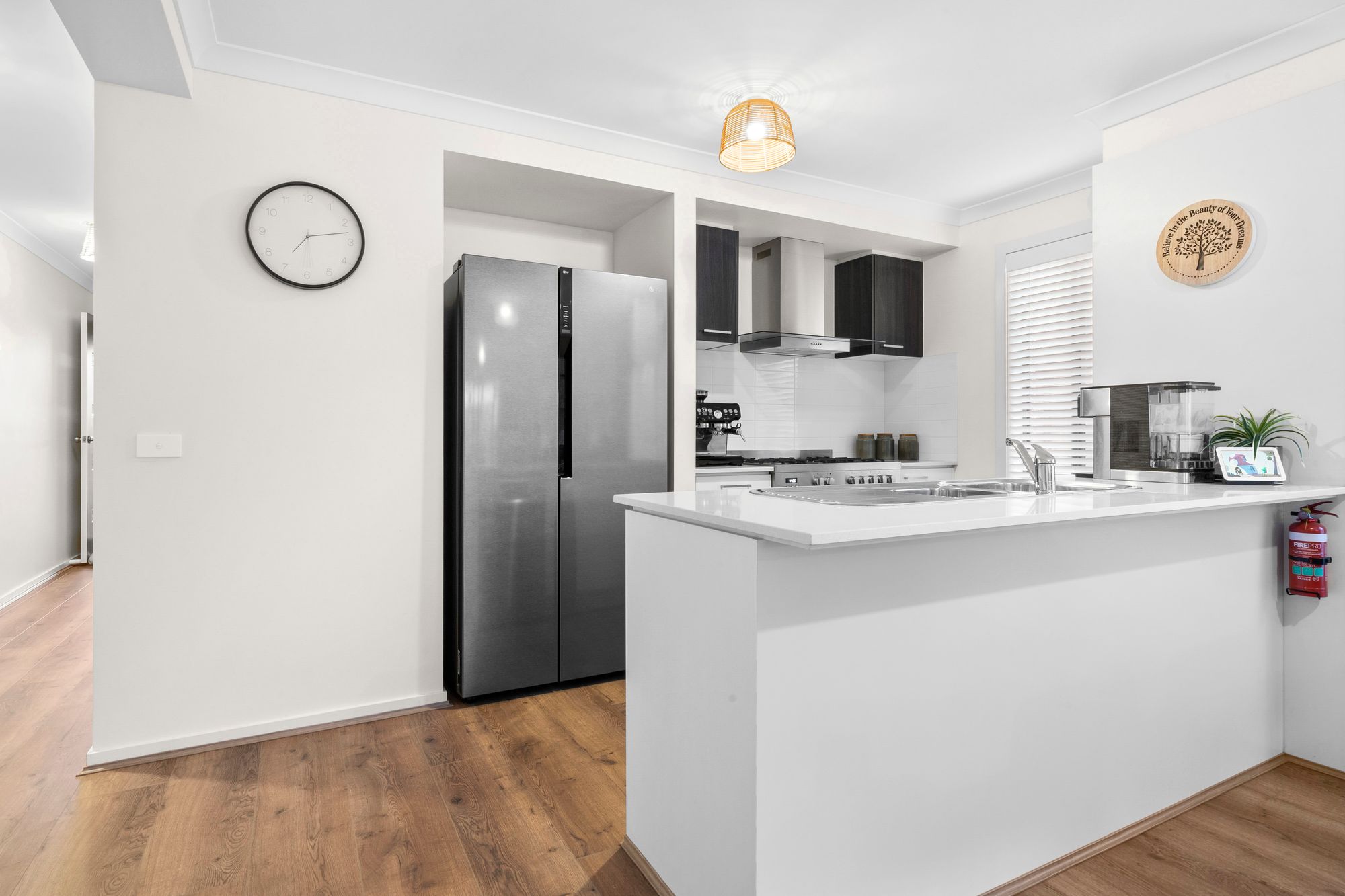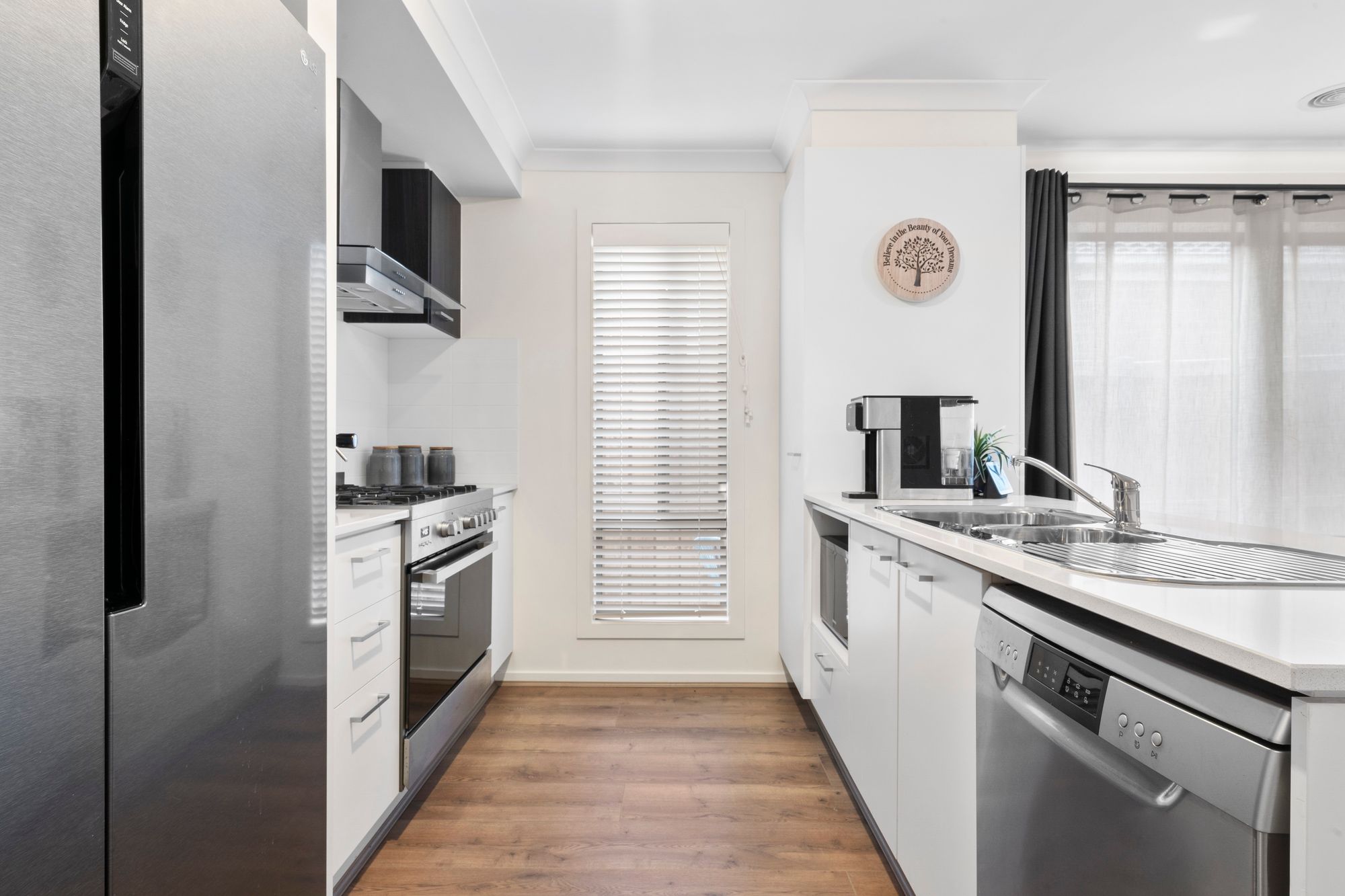 Kitchen: Timber laminate floor boards, dishwasher, oven, range hood, 5-burner gas cook top, stone bench tops, double sink, allocated fridge space, built in pantry, overhead cabinetry, tiled splash back & Venetian blinds.
