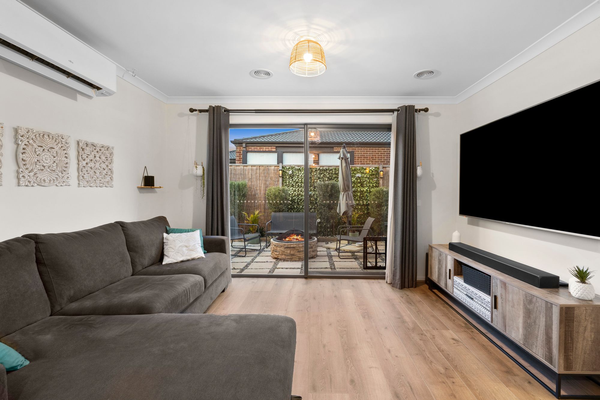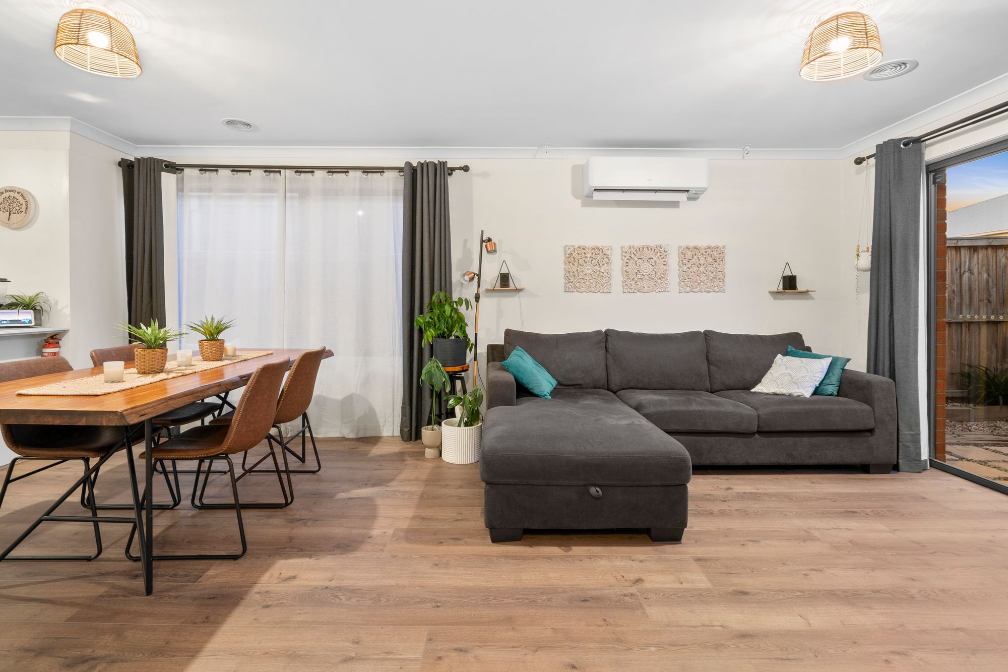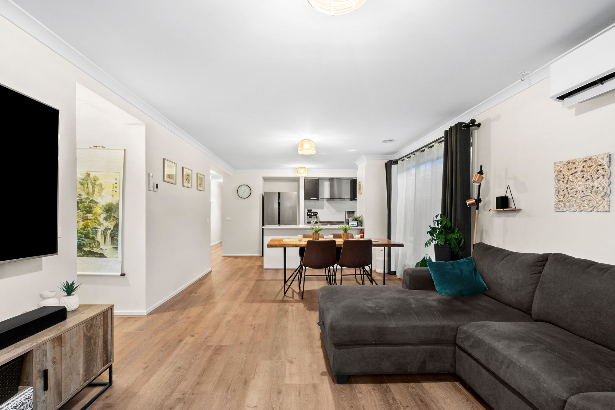 Living & Dining: Open plan design, timber laminate floor boards, double curtains, air conditioner, ducted heating & glass sliding doors for external access.