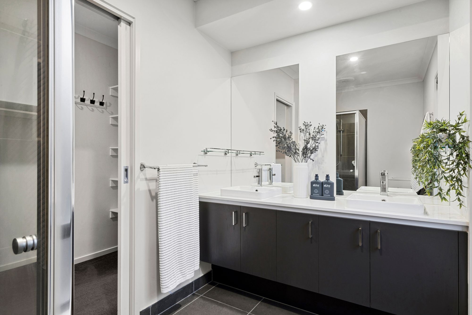 Master Suite: Large/spacious, carpet, large walk-in wardrobe with shelving, ample downlights, bedside power-points, roller blinds & sheer curtains, ducted heating & evaporative cooling, Ensuite; Tiled, semi-frameless shower with handheld shower head, double vanity with dual basins and storage, 20mm stone benchtop, downlights, his and her’s mirror, frosted window, personal toilet, chrome fittings, bulkhead with downlight