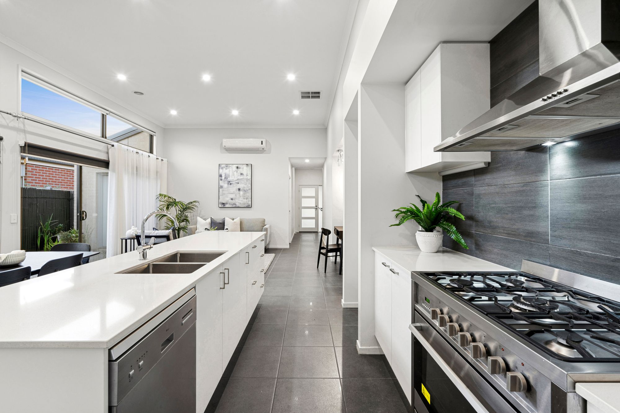 Kitchen: Open plan kitchen/living/dining, Tiled flooring, 20mm stone benchtops, stunning feature 12ft ceilings, long island bench with breakfast bar & LED strip lighting, dual undermount sink, tiled splash back, down lights, 900mm gas oven/cooktop & rangehood, dishwasher, microwave provision, large walk-in pantry with cavity sliding door & Sensor light, never ending bench space, ample storage, overhead cabinetry, fridge cavity, ducted heating & evaporative cooling complimented by a reverse-cycle spit-system unit, sheer curtains & roller blinds, abundance of natural light, dual section glass stacker doors to side courtyard area.