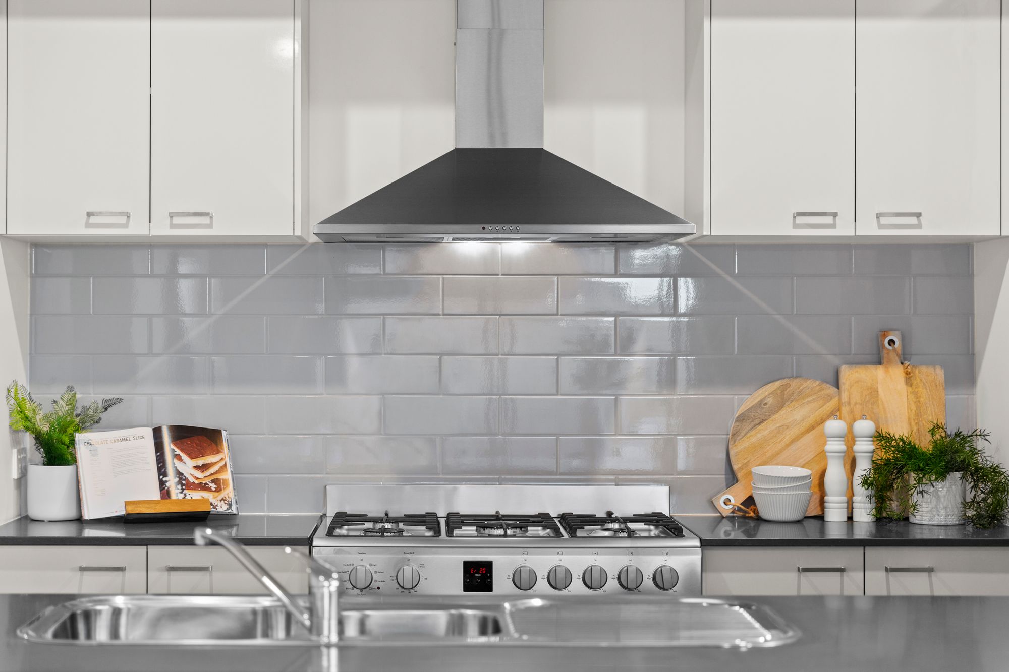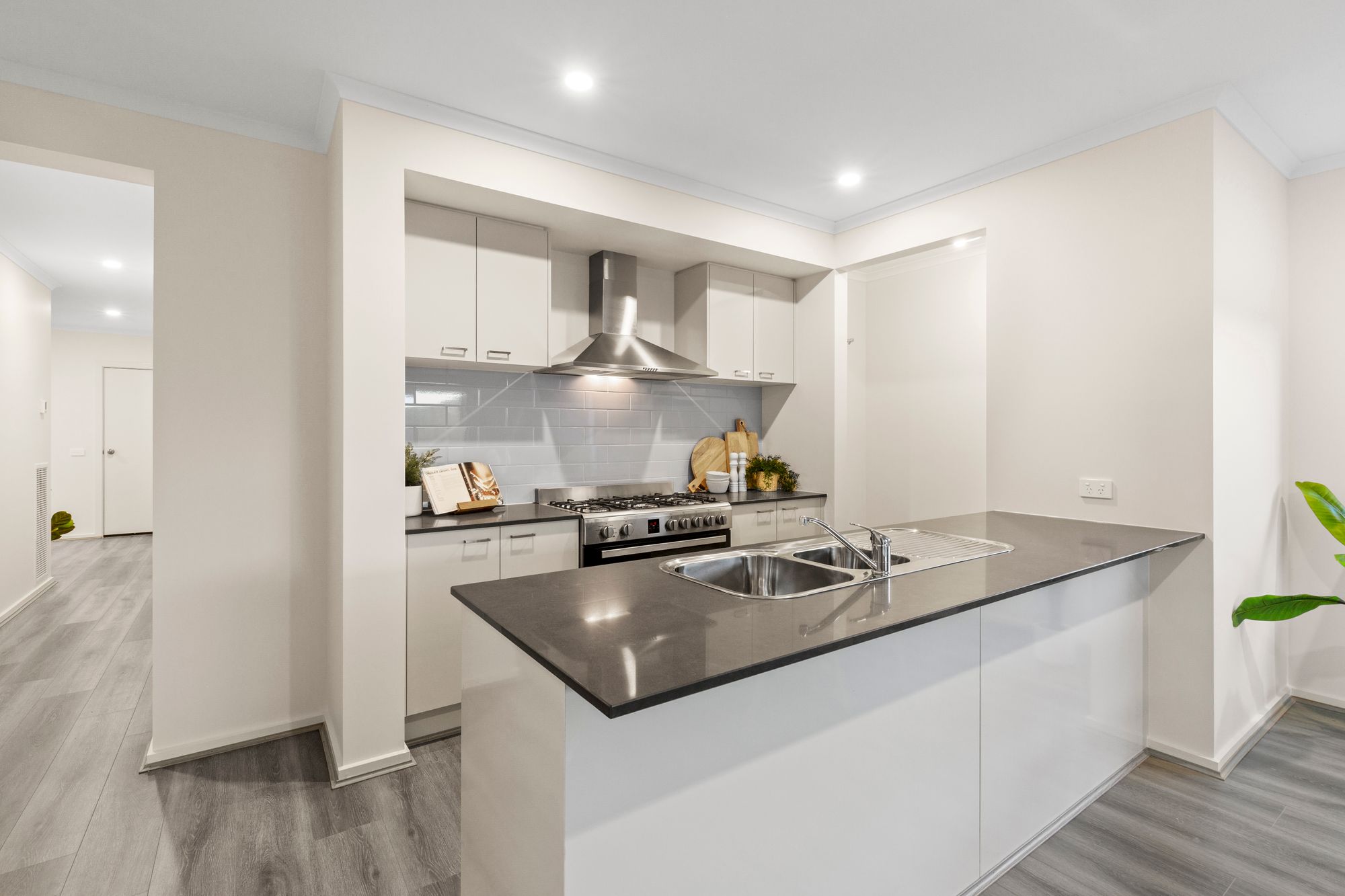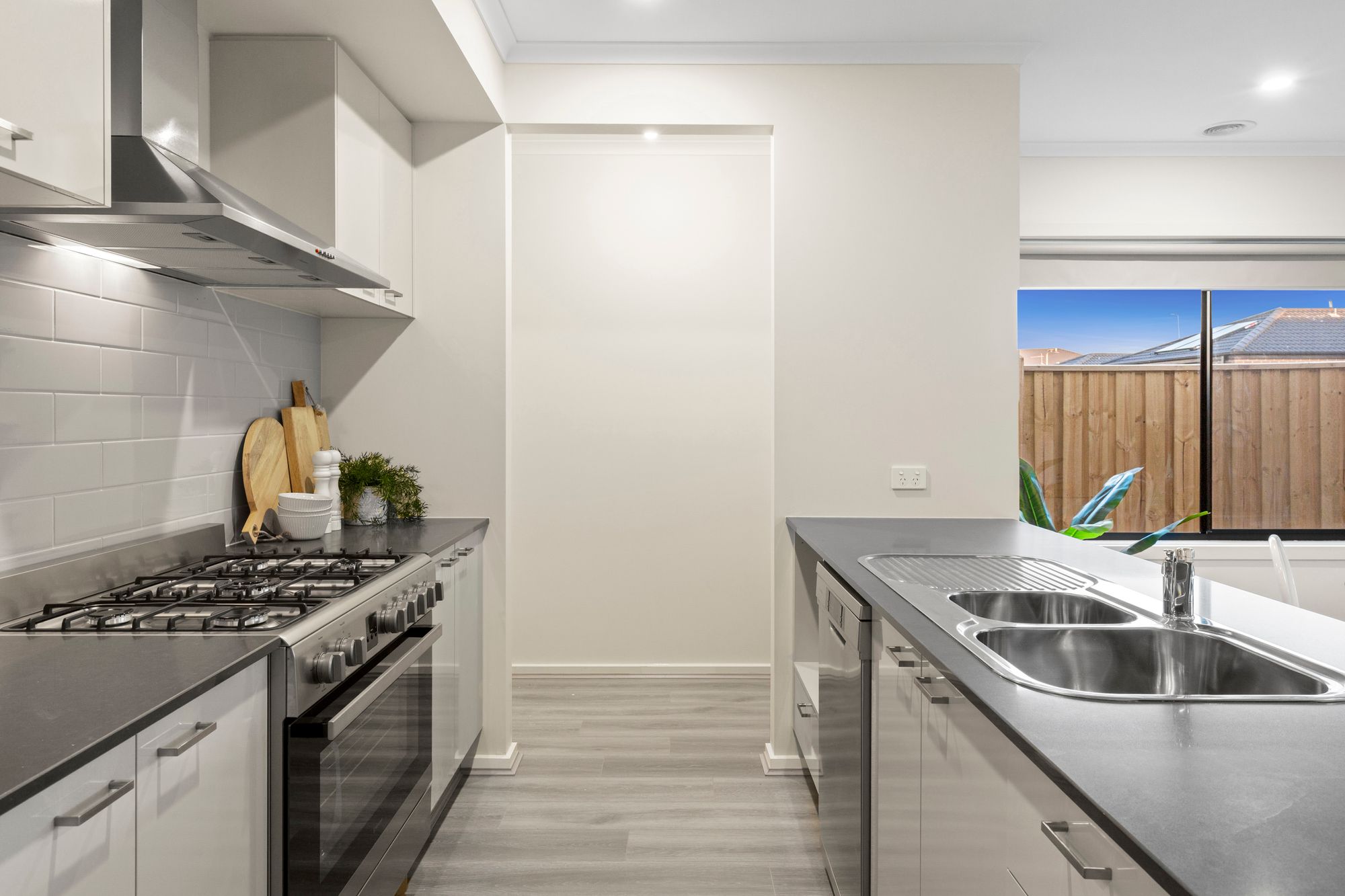 Kitchen- 900mm gas cooktop, oven & rangehood, subway tile splashback, 20mm stone benchtops, dishwasher, walk in pantry with built in shelving, double sink, chrome fittings, downlights