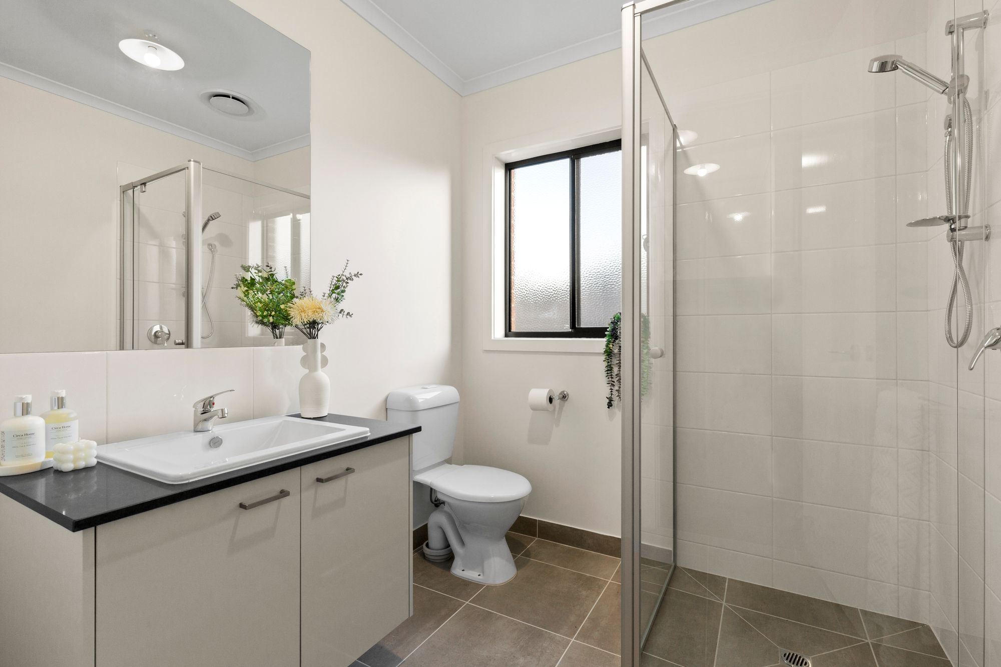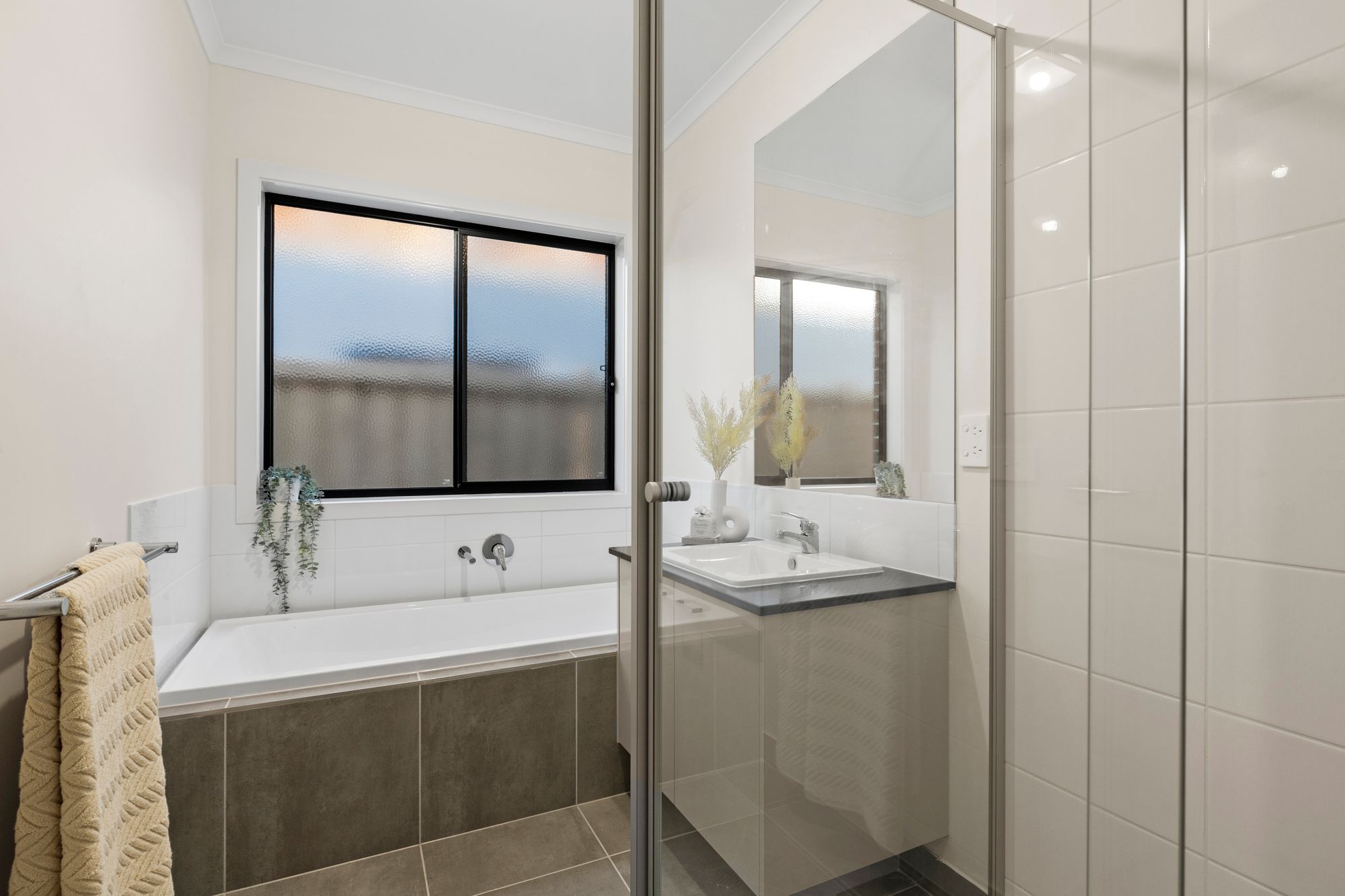 Main bathroom- single vanity, tile splashback, 20mm stone benchtop, single shower tiled top-to-toe, bath, frosted window & separate toilet