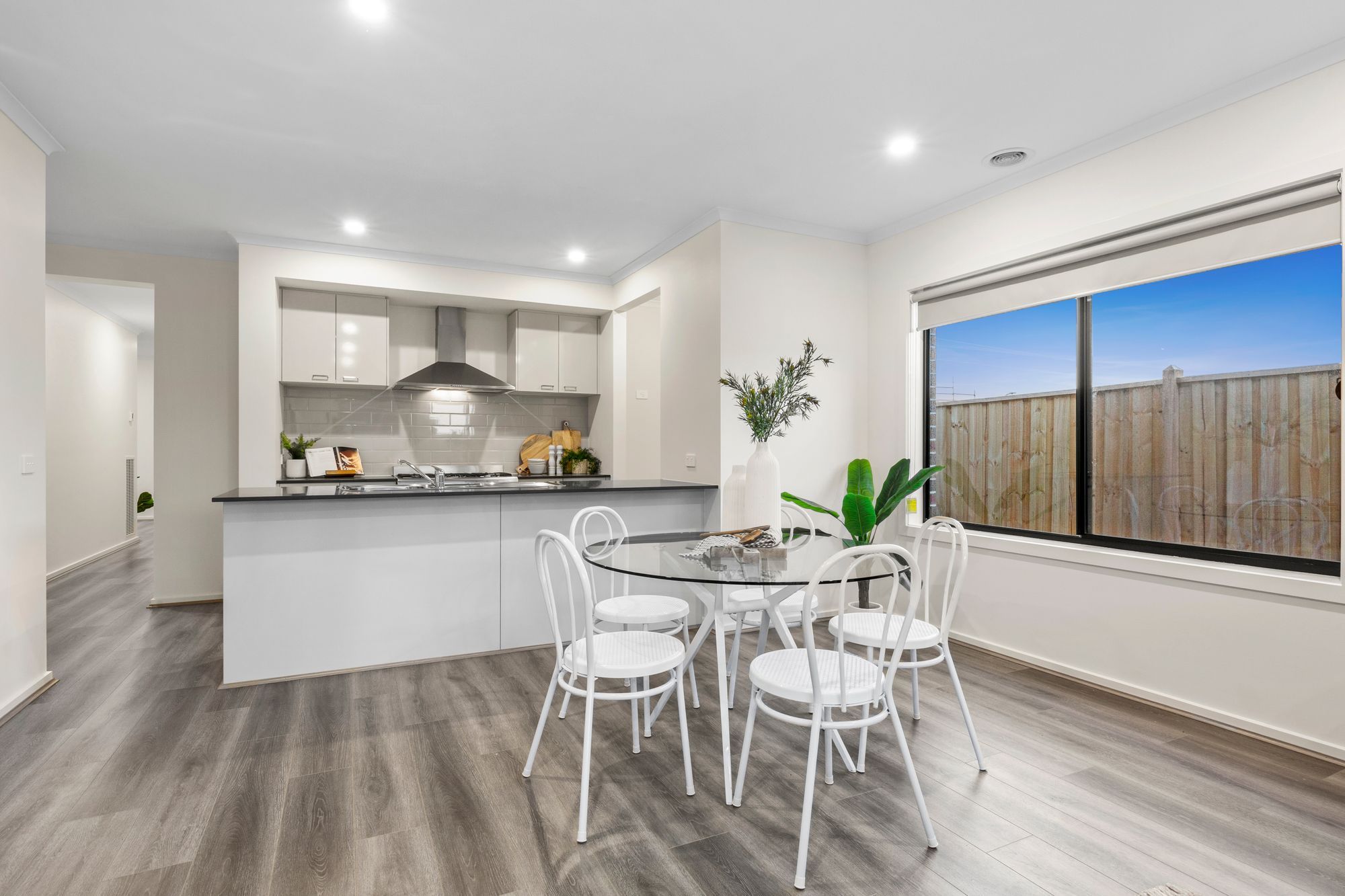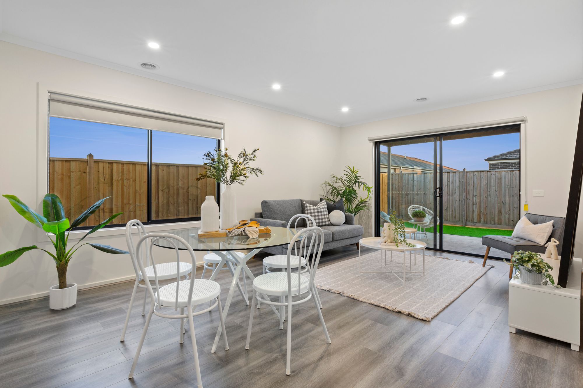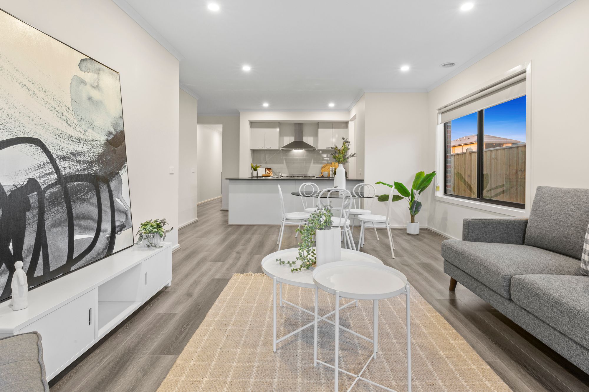 Living- open plan adjoining living/dining/kitchen, timber laminate flooring, gas ducted heating, downlights, windows with roller blinds, glass sliding doors for external access to back yard and undercover patio
