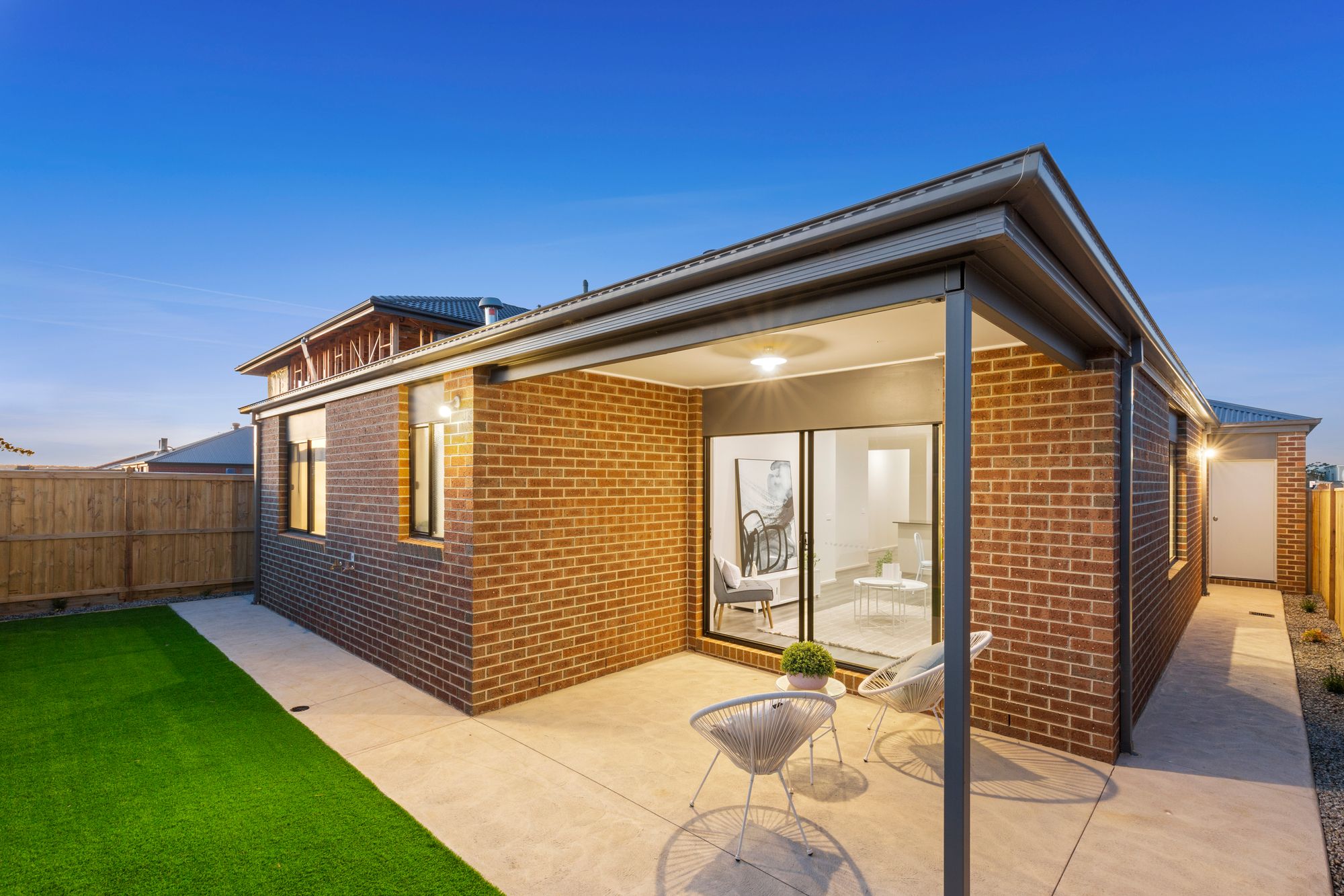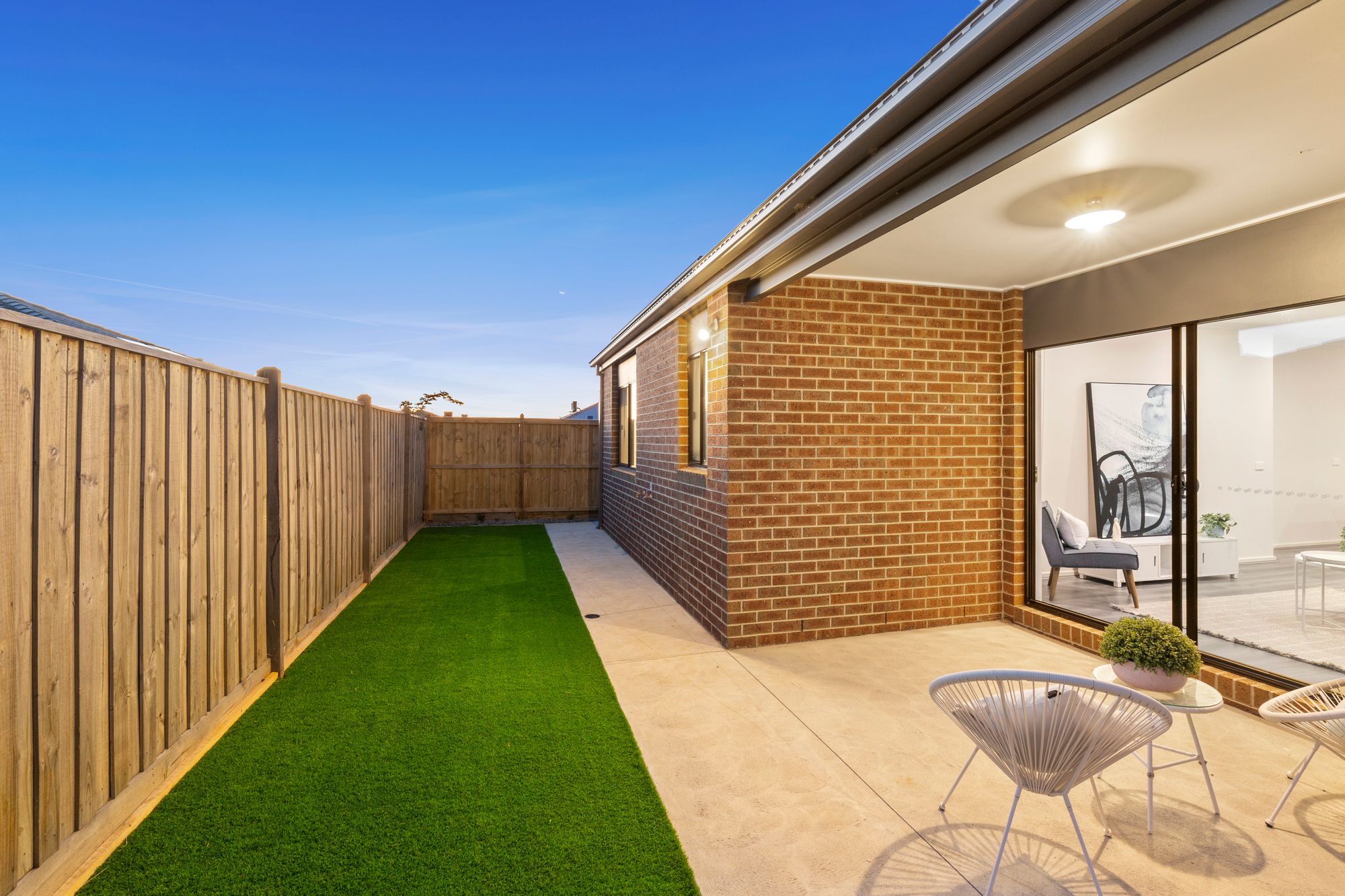 Outdoor- undercover concrete patio and side paths, artificial grass yard, outdoor lights, side access into garage & gate access to front yard