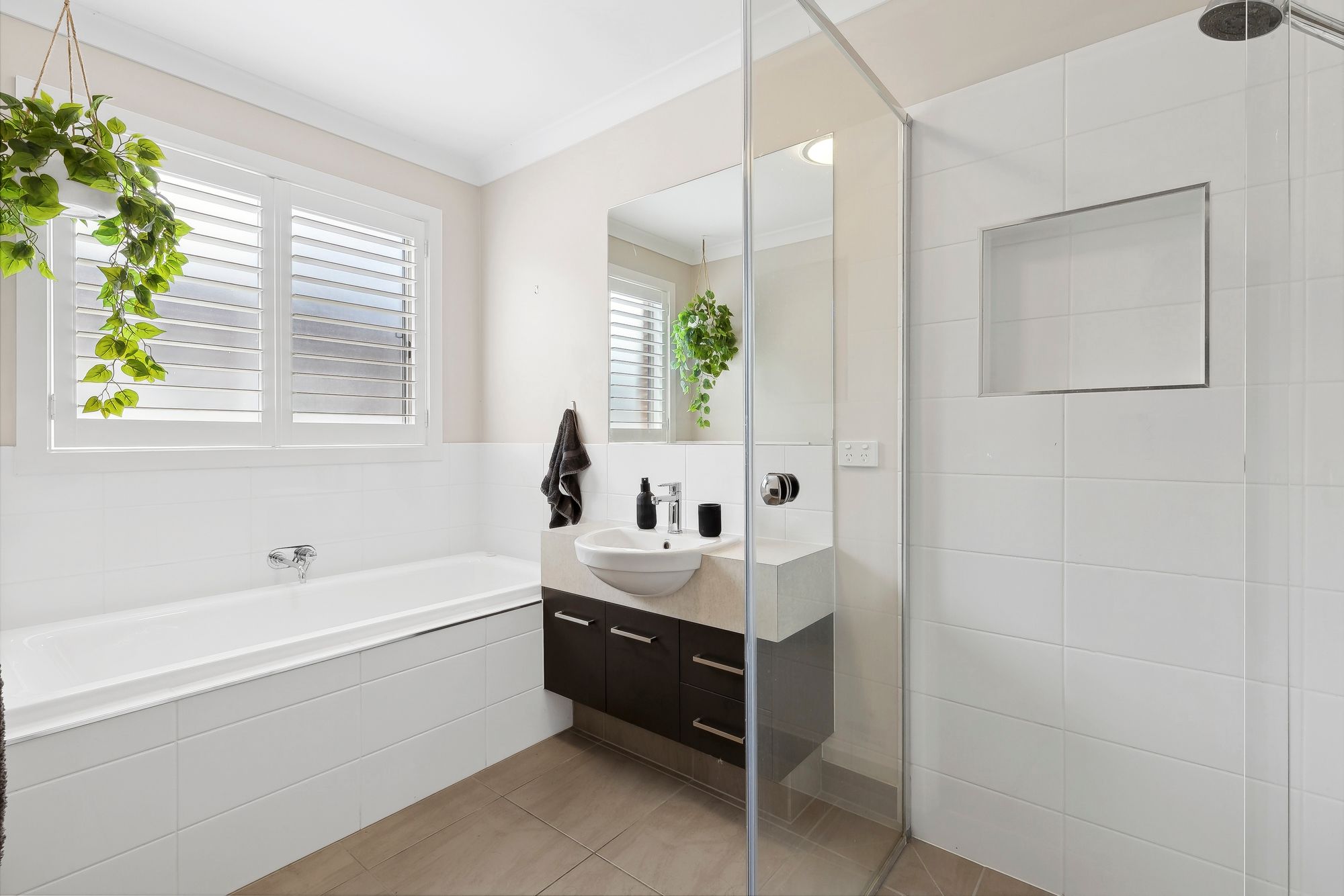 Additional Bathroom: Effortlessly servicing the household and the bedrooms surrounding, the secondary bathroom homes a single basin and vanity with upgraded storage, tiled shower with handheld and wall mounted showerhead, raised bath and a window with plantation blinds.