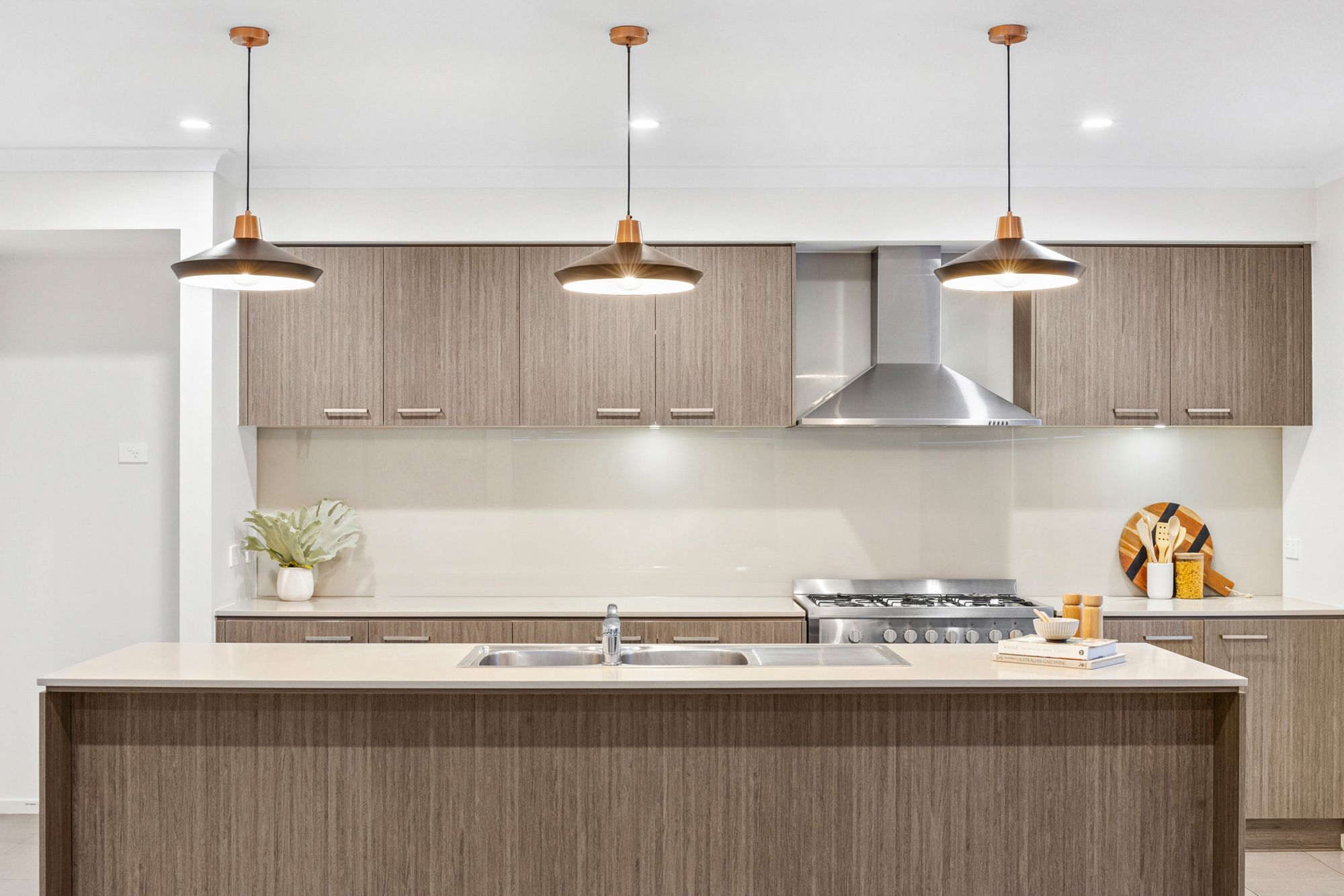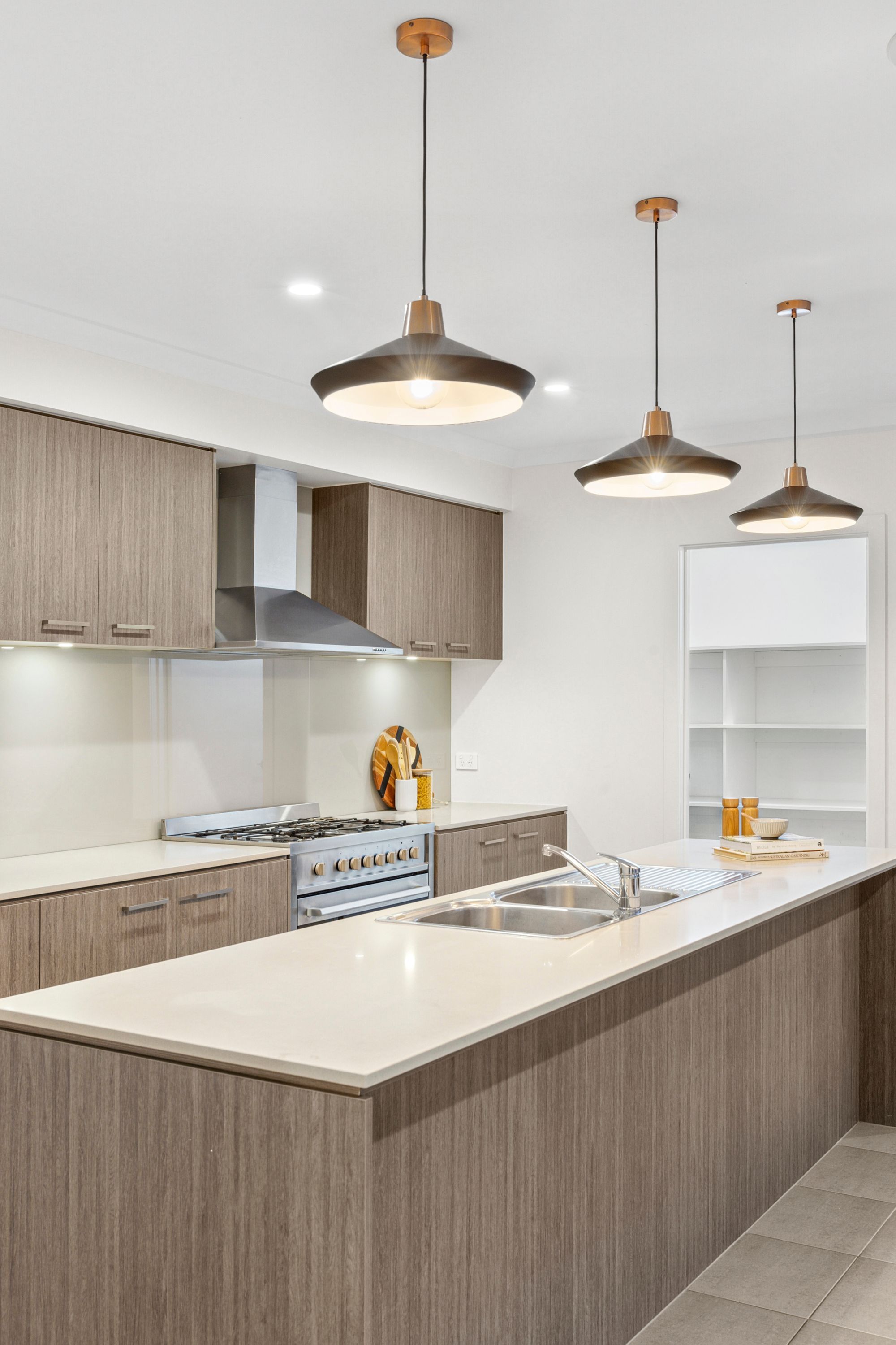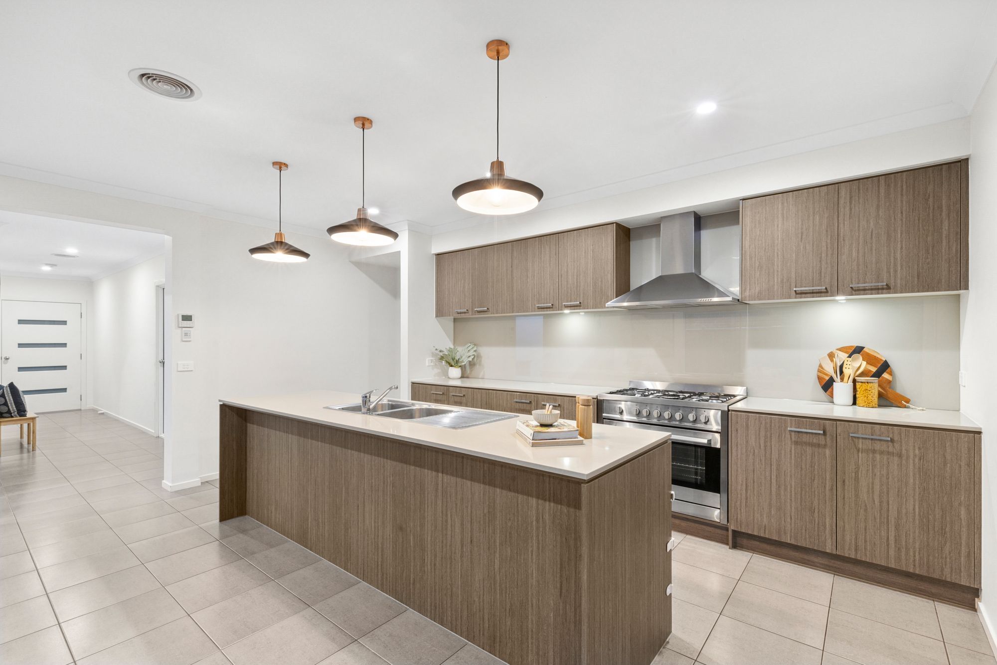 Kitchen – Open plan kitchen complete with a double basin sink set on 20mm stone benchtops with a breakfast bar overhang to the island bench. Rear kitchen bench space features a free-standing 900mm oven and stovetop. Walk-in pantry with a wide windows and roller blinds, fantastic sized fridge cavity, pendant lighting, gas ducted heating and refrigerated cooling.