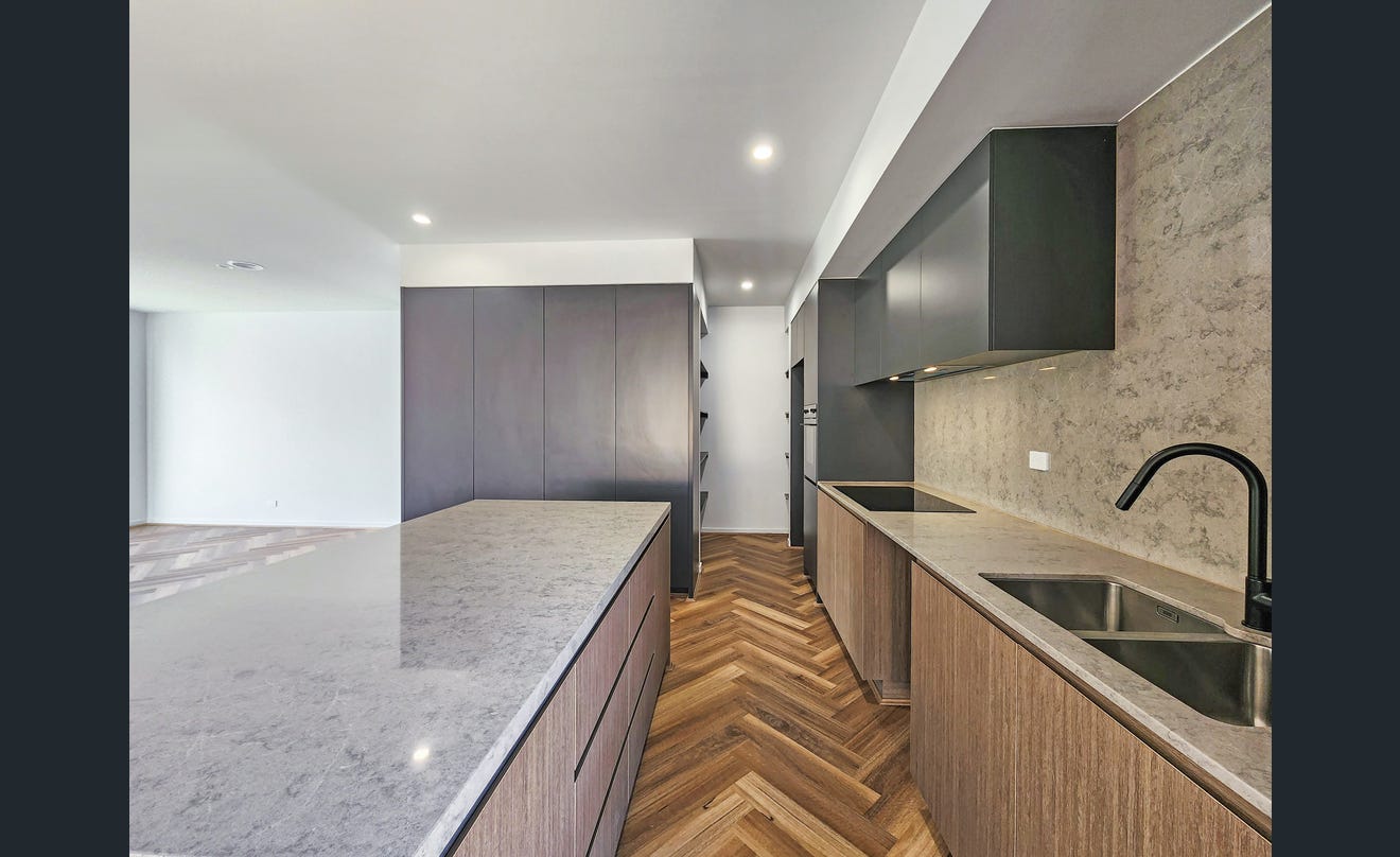 Open plan kitchen, living and dining area with induction cooktop and electric oven