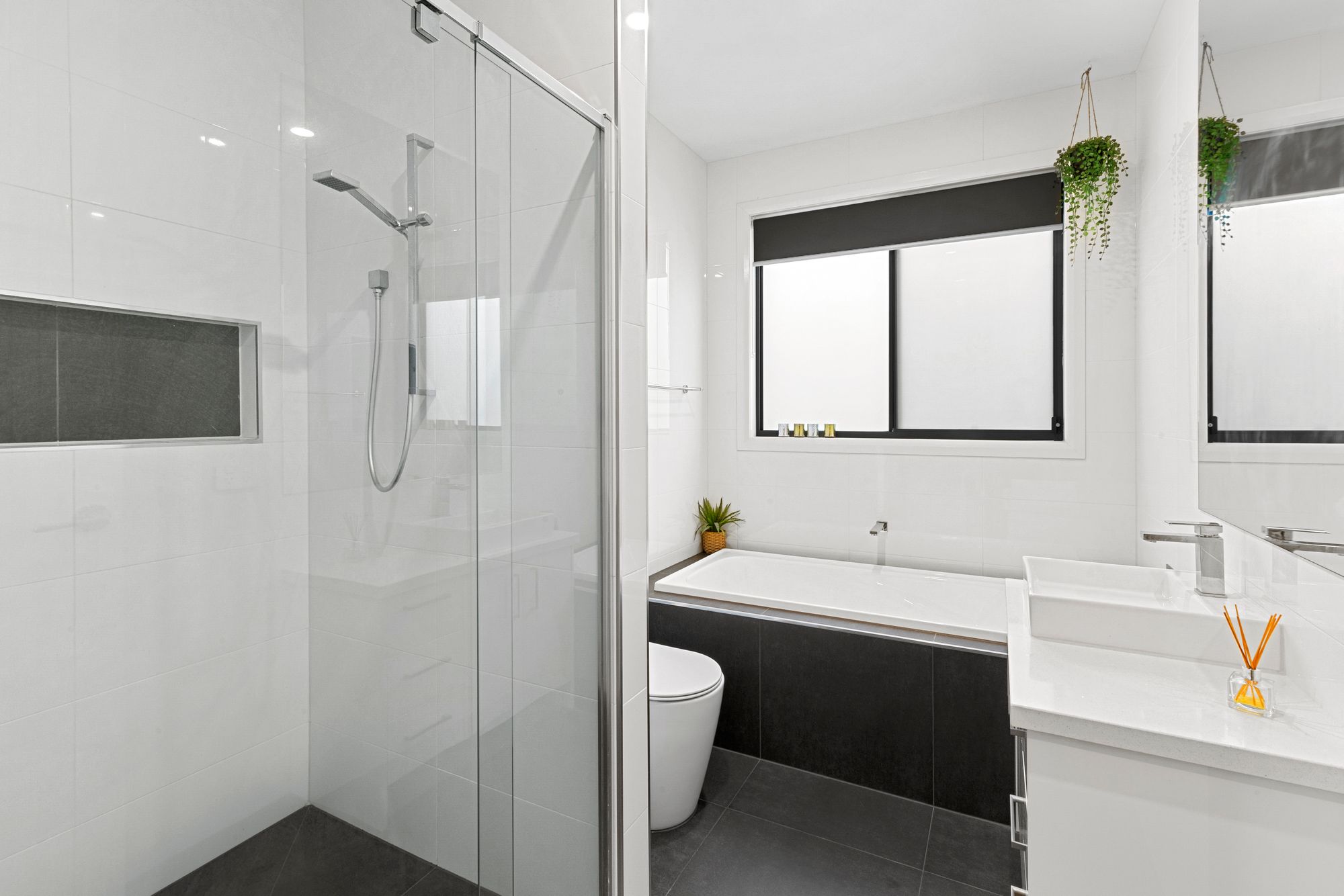 Main bathroom: Extended large shower, upgraded tap ware, extended shower niche, fully tiled, 40mm stone benchtop, single vanity with ample storage and extended mirror, bath, frosted glass, roller blind, open toilet, downlights, raised ceilings.