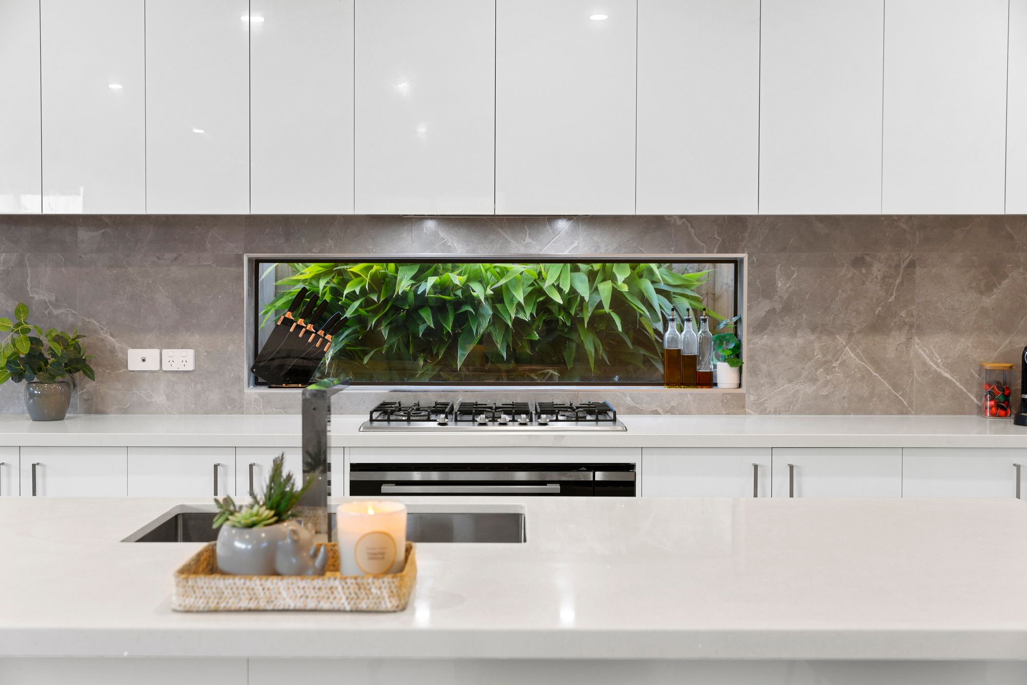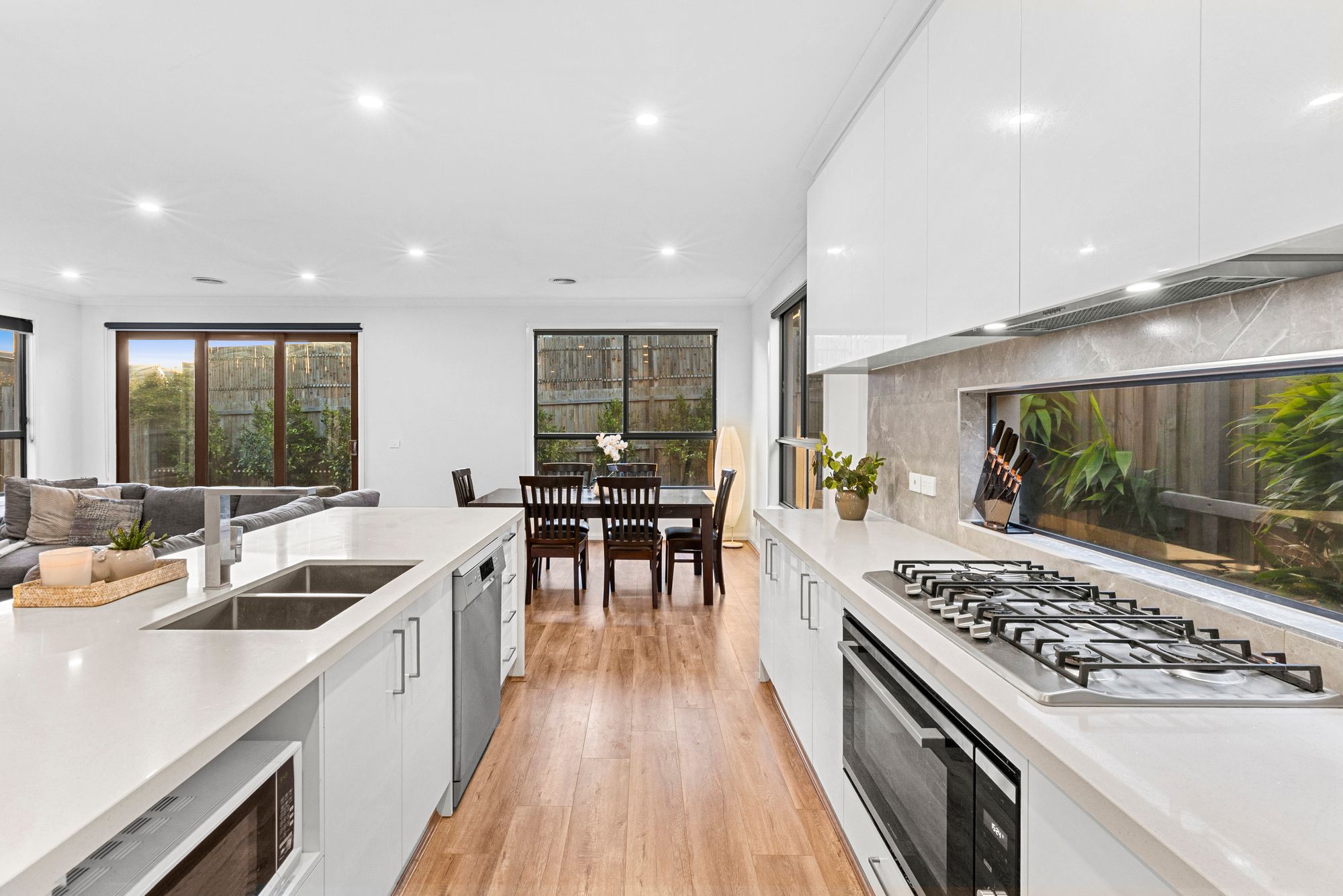 Kitchen: 40mm waterfall stone bench top, extended breakfast bar overhand, inset sink, upgraded tap, 900mm built in stove cooktop and oven with hidden range hood, marble look splashback with feature landscape window, overhead cabinetry, ample storage, dishwasher, microwave provision, drawers, walk in pantry with door, fridge cavity, timber laminate, downlights.
