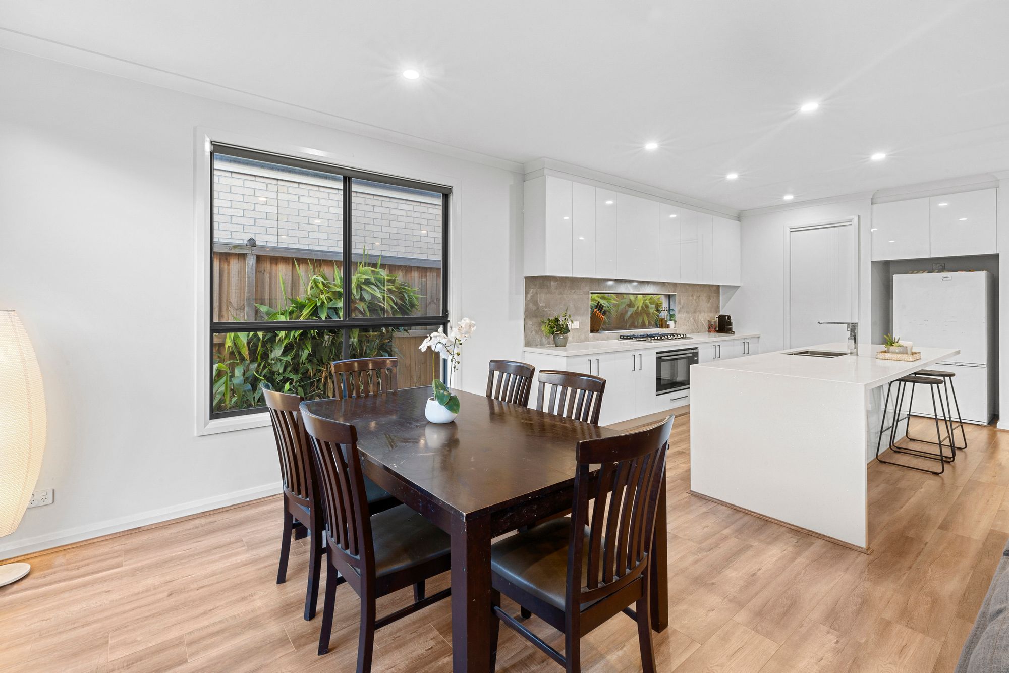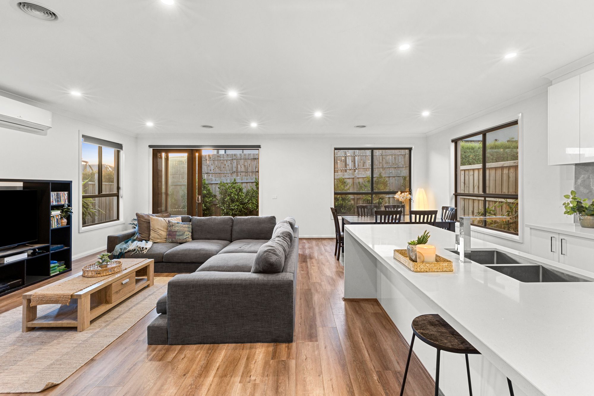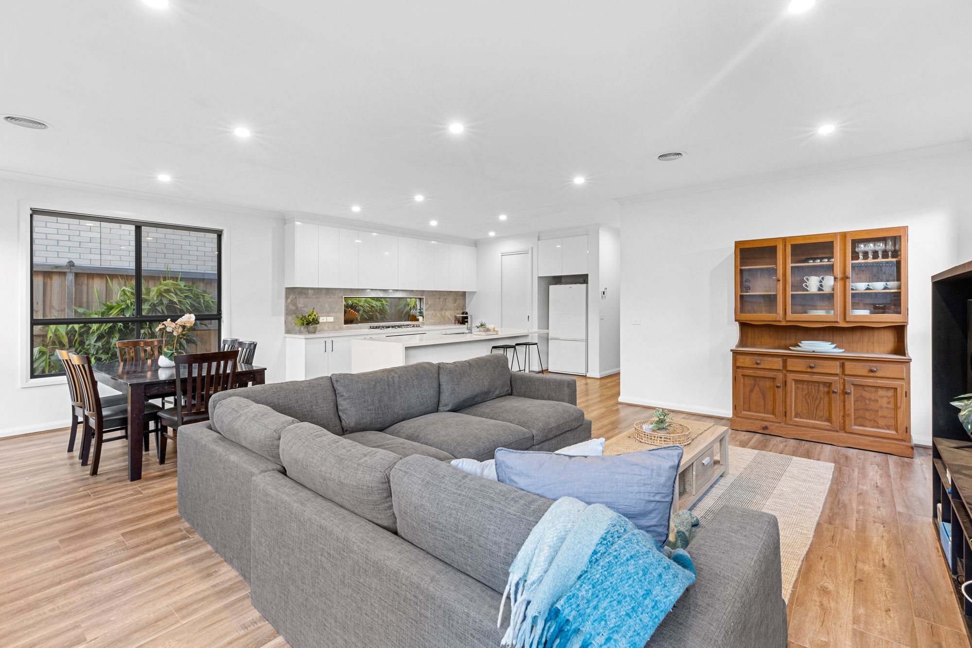 Living: Open plan adjoining living/dining/kitchen, feature windows, three panel stacker sliding doors open from living through to outdoor alfresco, timber laminate flooring, split system cooling, roller blinds, ducted heating, downlights, PowerPoints.
