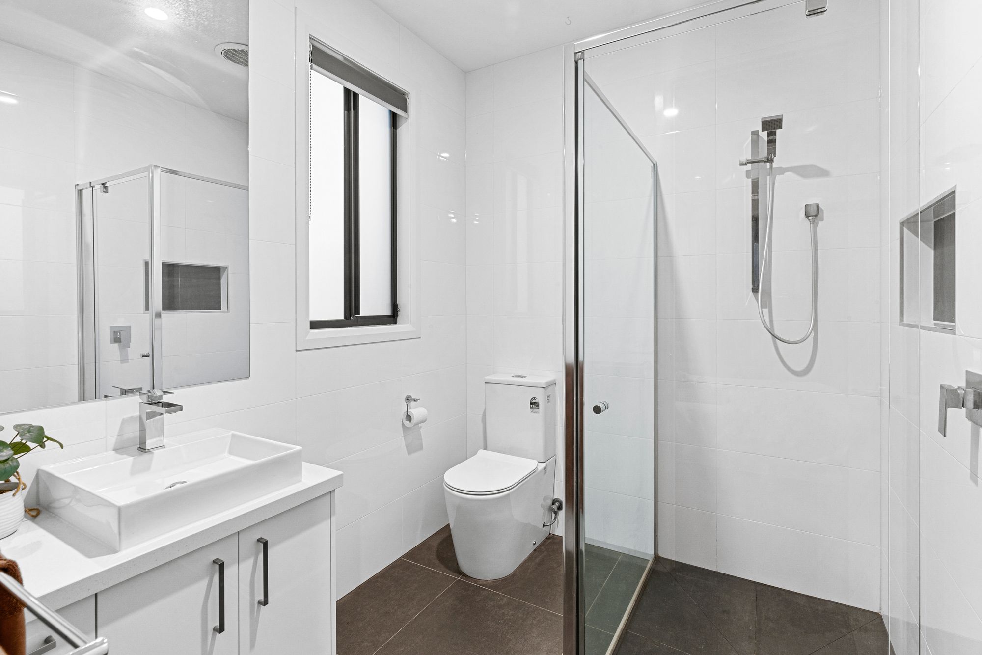 Ensuite: 40mm stone benchtop, single vanity with ample storage, extended shower with shower niche, fully tiled ensuite, upgraded handheld shower head, open toilet, downlights, frosted glass window.