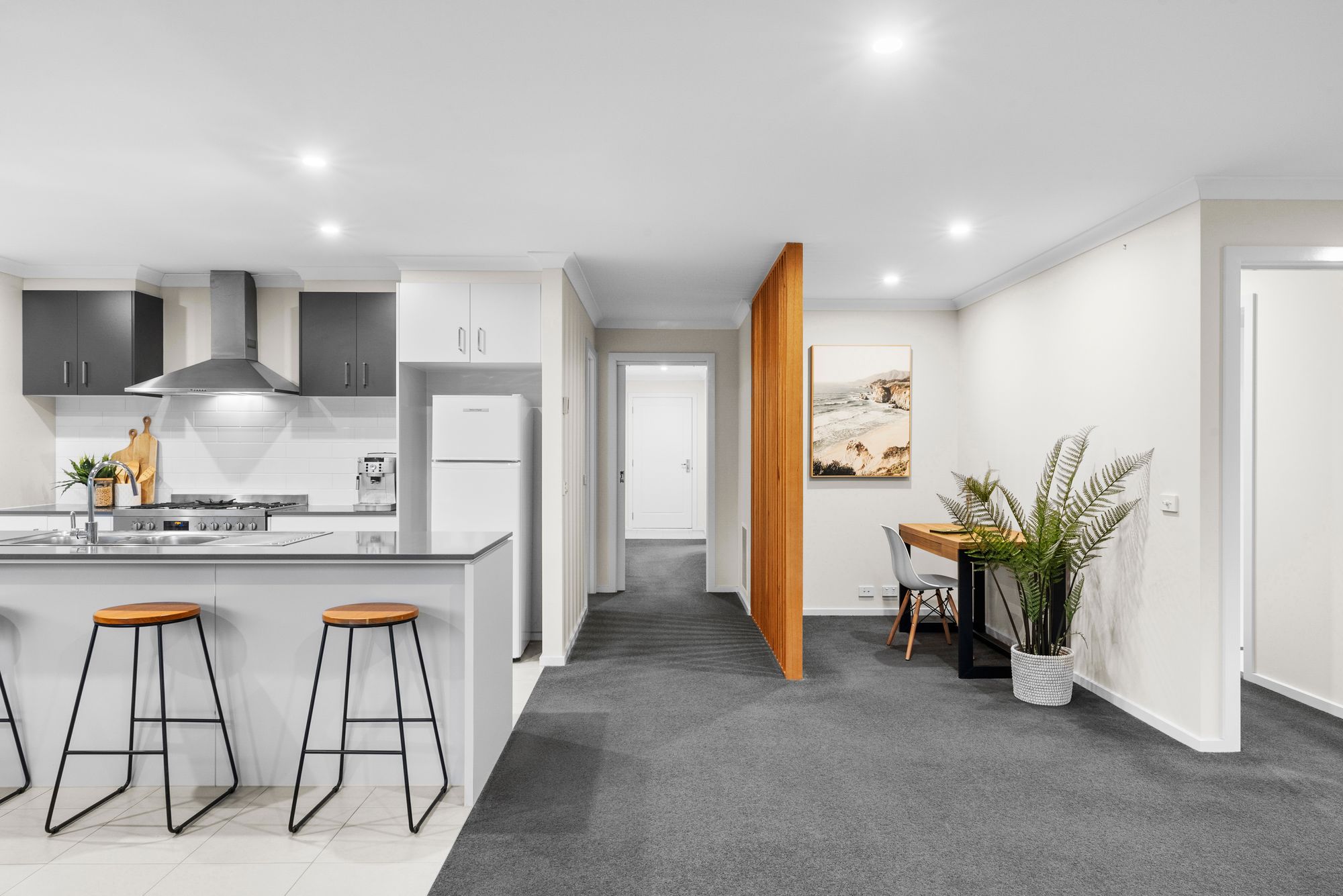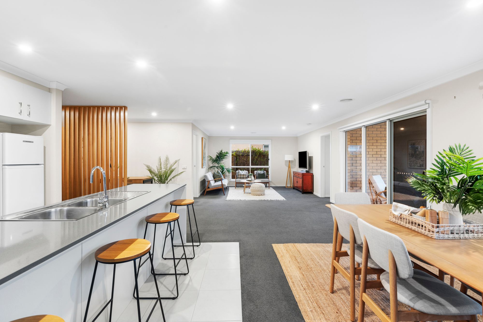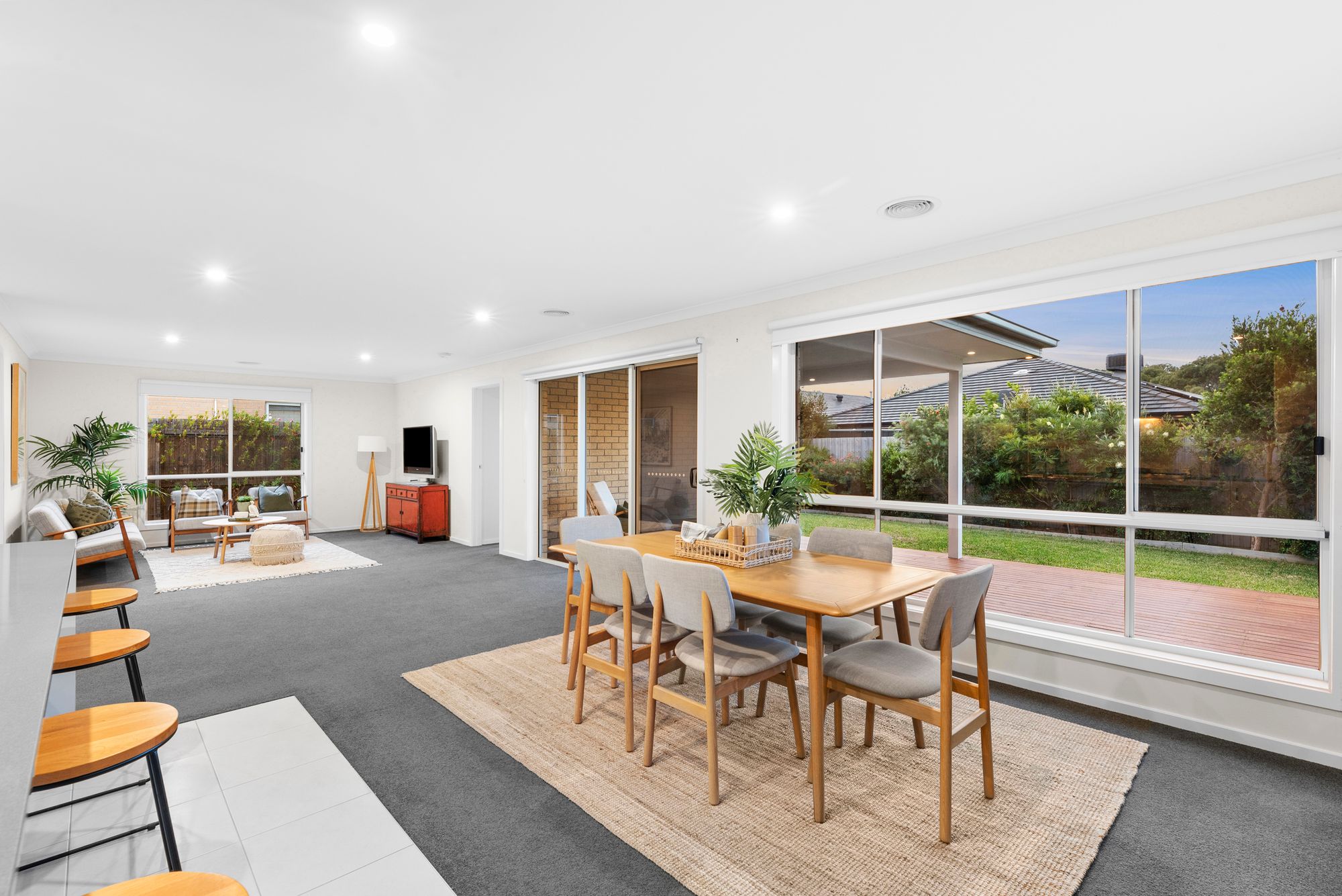 Dining – Large open plan kitchen/living/dining area with wide windows with roller blinds and glass sliding doors through to the undercover outdoor living space, downlights, ducted heating, carpeted.