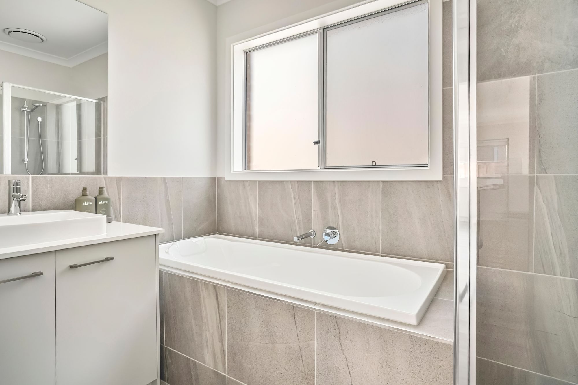Main bathroom: semi frameless shower, bath, tiles, single basin with stone bench and vanity, tile and mirror splashback and chrome fittings.