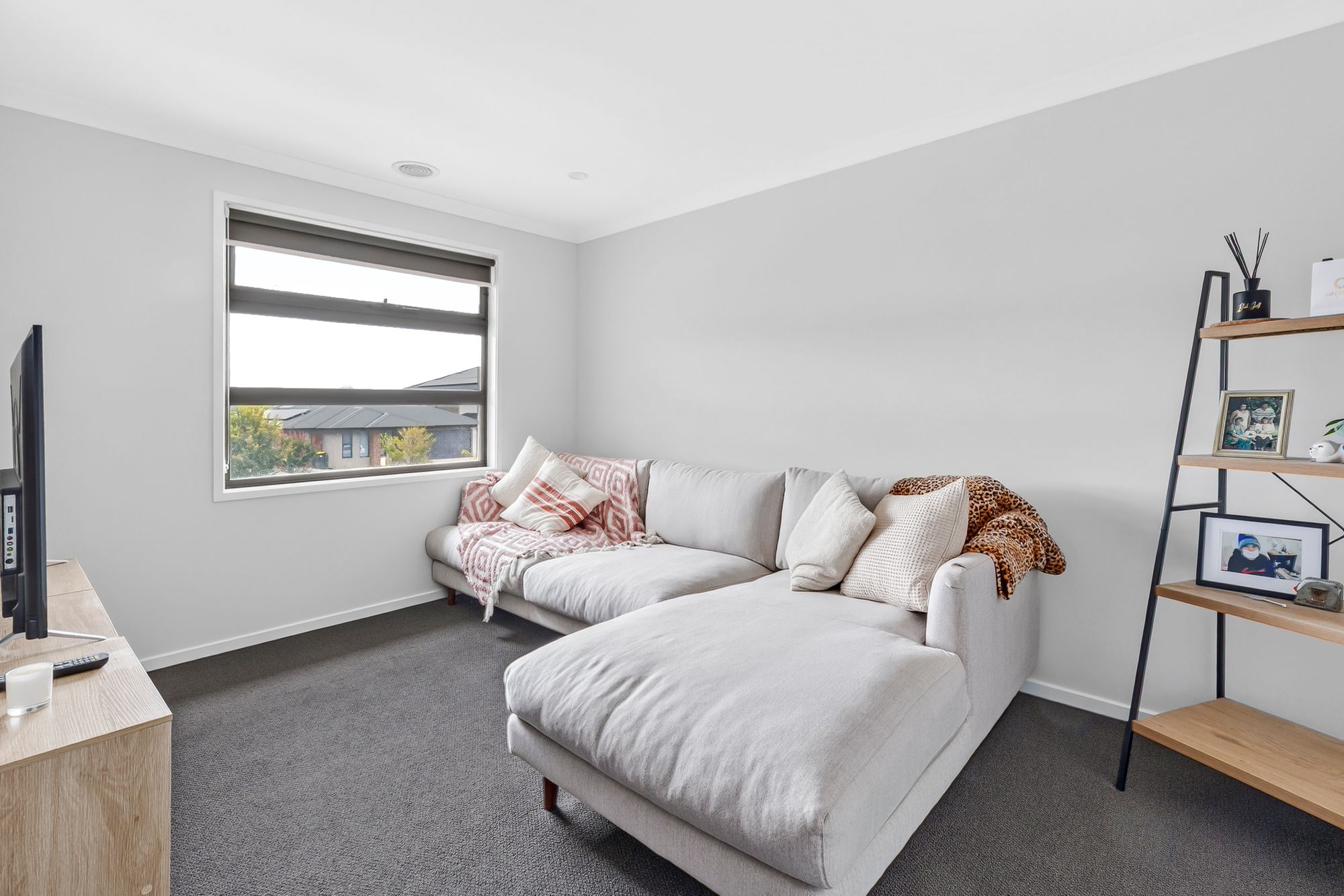 Second living – Semi-secluded downstairs, high ceilings, downlights, north facing awning windows allowing natural light, roller blinds, power points, ducted heating, timber-laminate flooring
