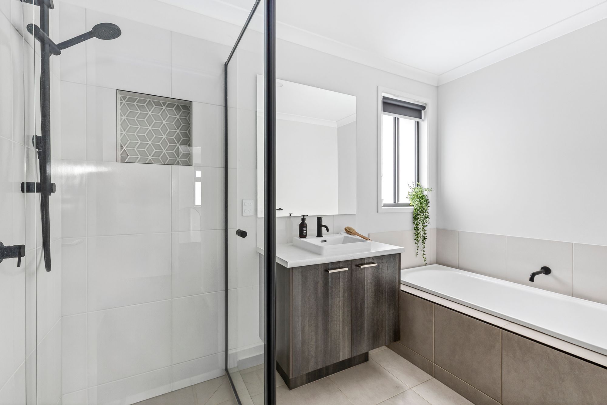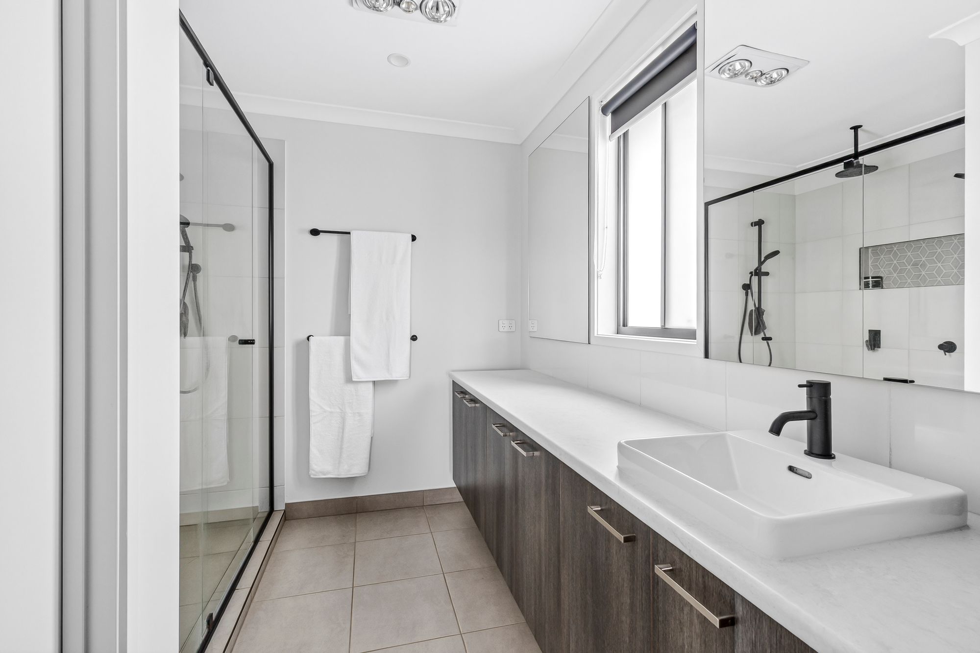 Bathrooms – Upstairs; Tiled flooring, single vanity with storage, mirror splash-back, semi-frameless shower with handheld shower head and niche with feature tiles, upgraded black fittings and tapware, downlights, power points, frosted window with roller blind, separate toilet,