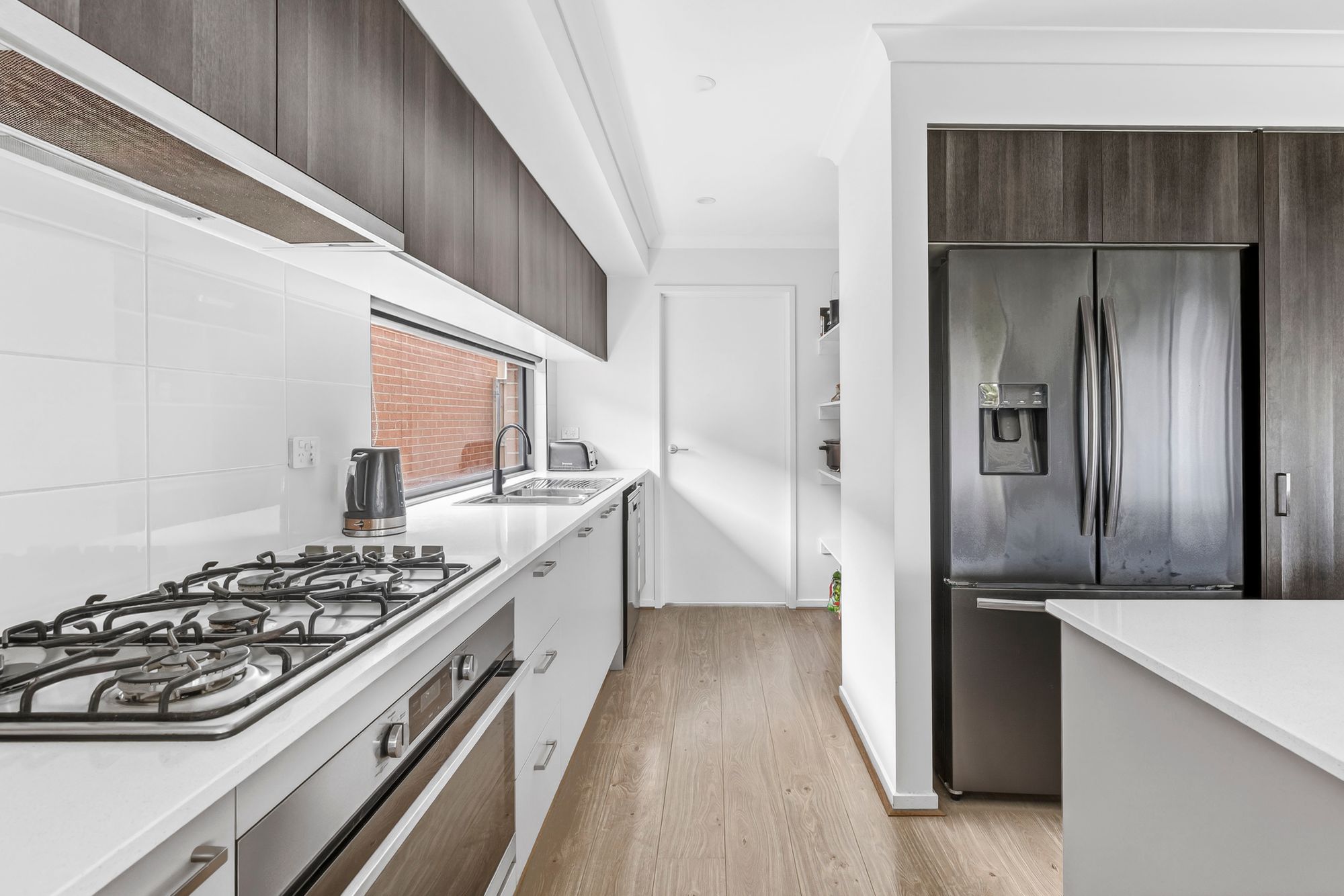 Kitchen – 20mm stone benchtops throughout, free island bench with breakfast bar overhang, 900mm integrated gas cooktop/oven/rangehood, long window splashback, pot drawers throughout, ample overhead cabinetry and cupboards for storage, microwave provision, fridge cavity, downlights, butler’s pantry with additional shelving, double sink drying tray, upgraded black tapware, timber-laminate flooring, high ceilings, access to laundry
