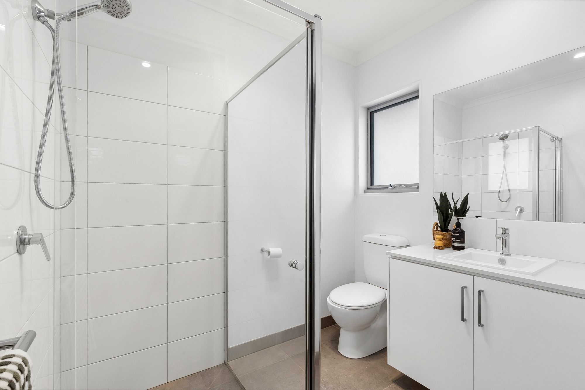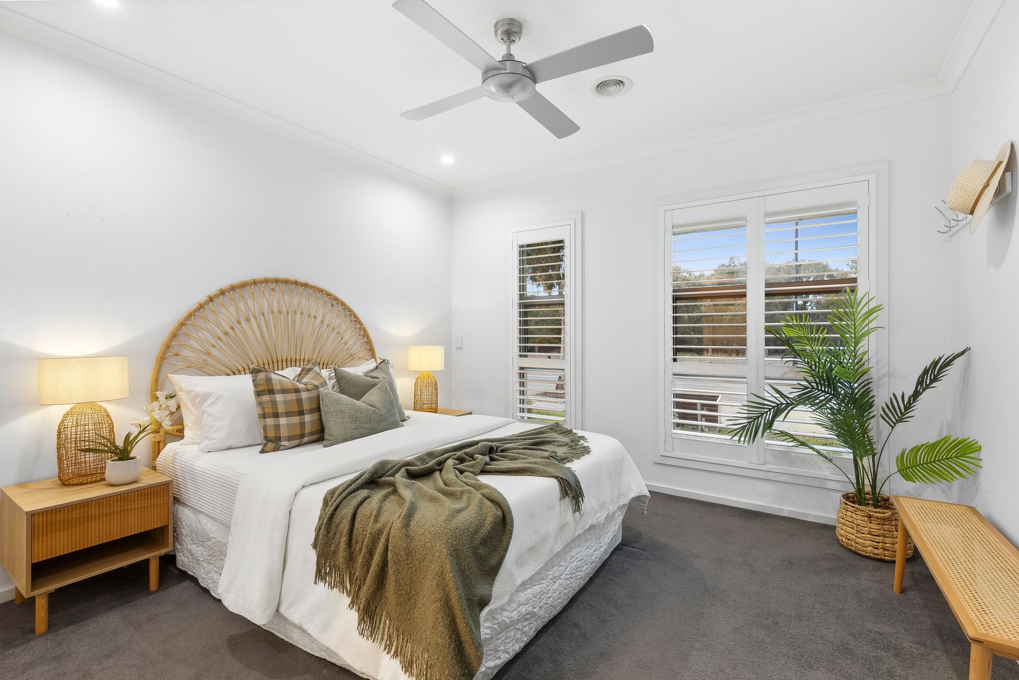 Master Suite: Generously sized and situated at the front of the home, it showcases a spacious walk-in robe and elegant ensuite. Complete with North-facing awning windows accompanied by plantation shutters, ducted heating and ceiling fan, creating a comfortable space year round. The gorgeous ensuite consists of a tiled shower with a wall-mounted/handheld showerhead, single basin on a 20mm stone benchtop vanity with tiled/mirrored splashback, toilet, downlights and frosted window.