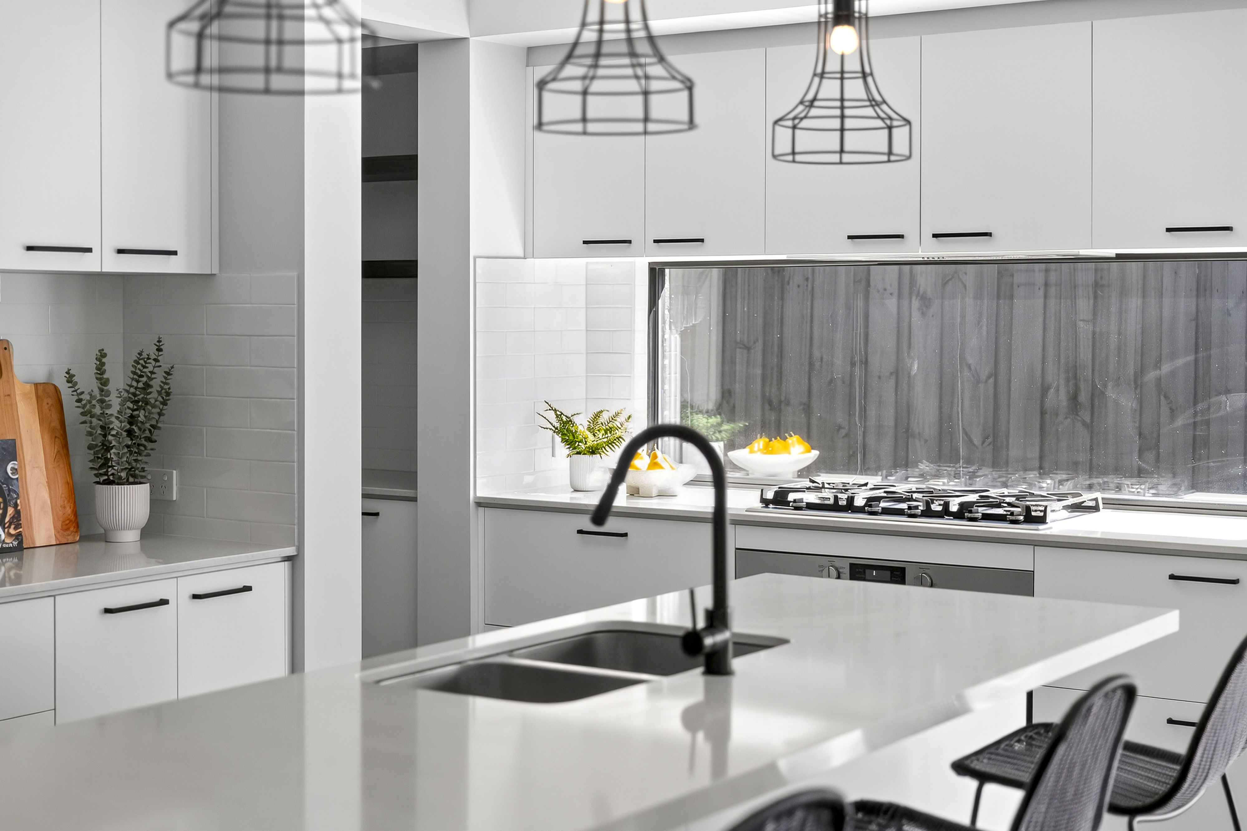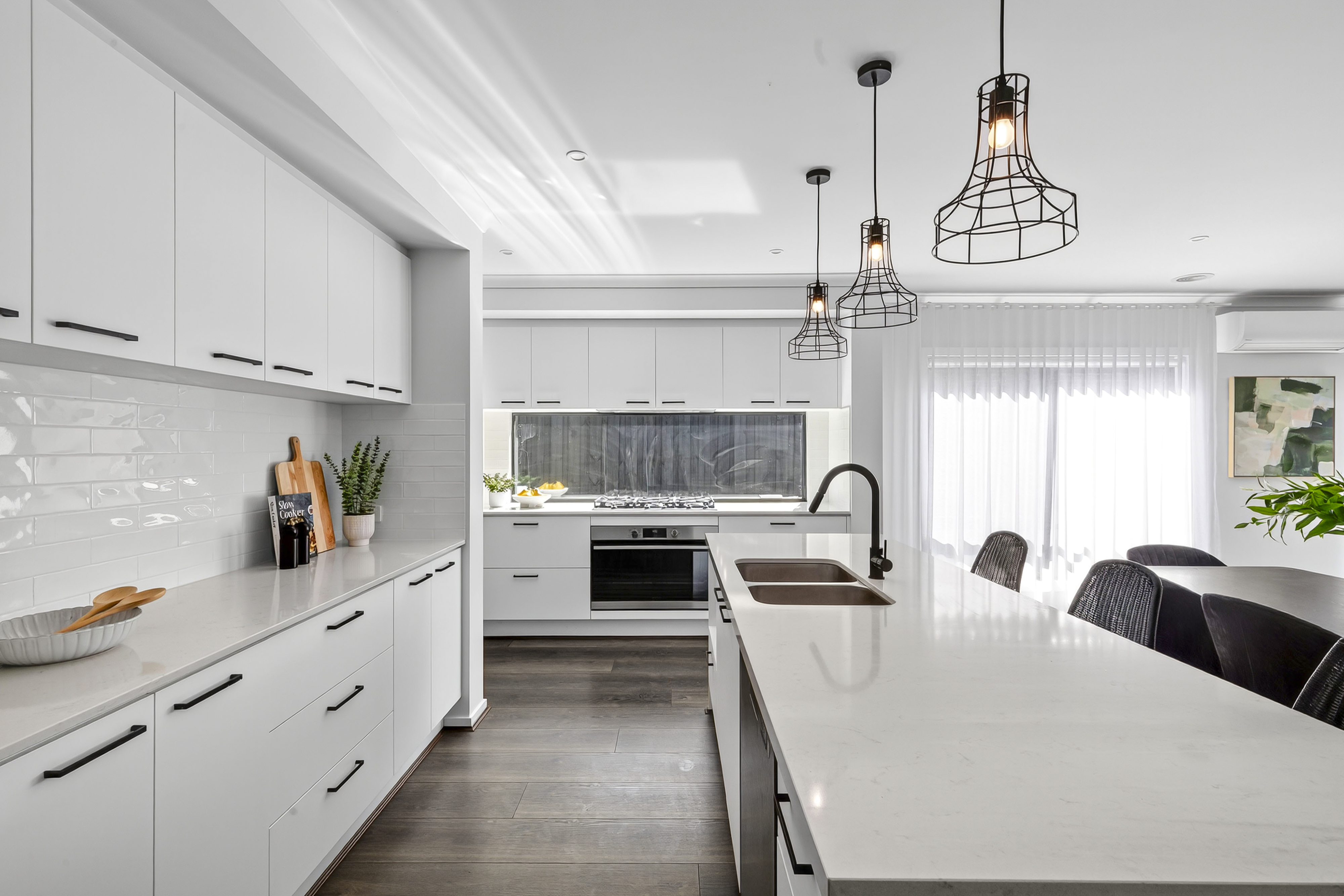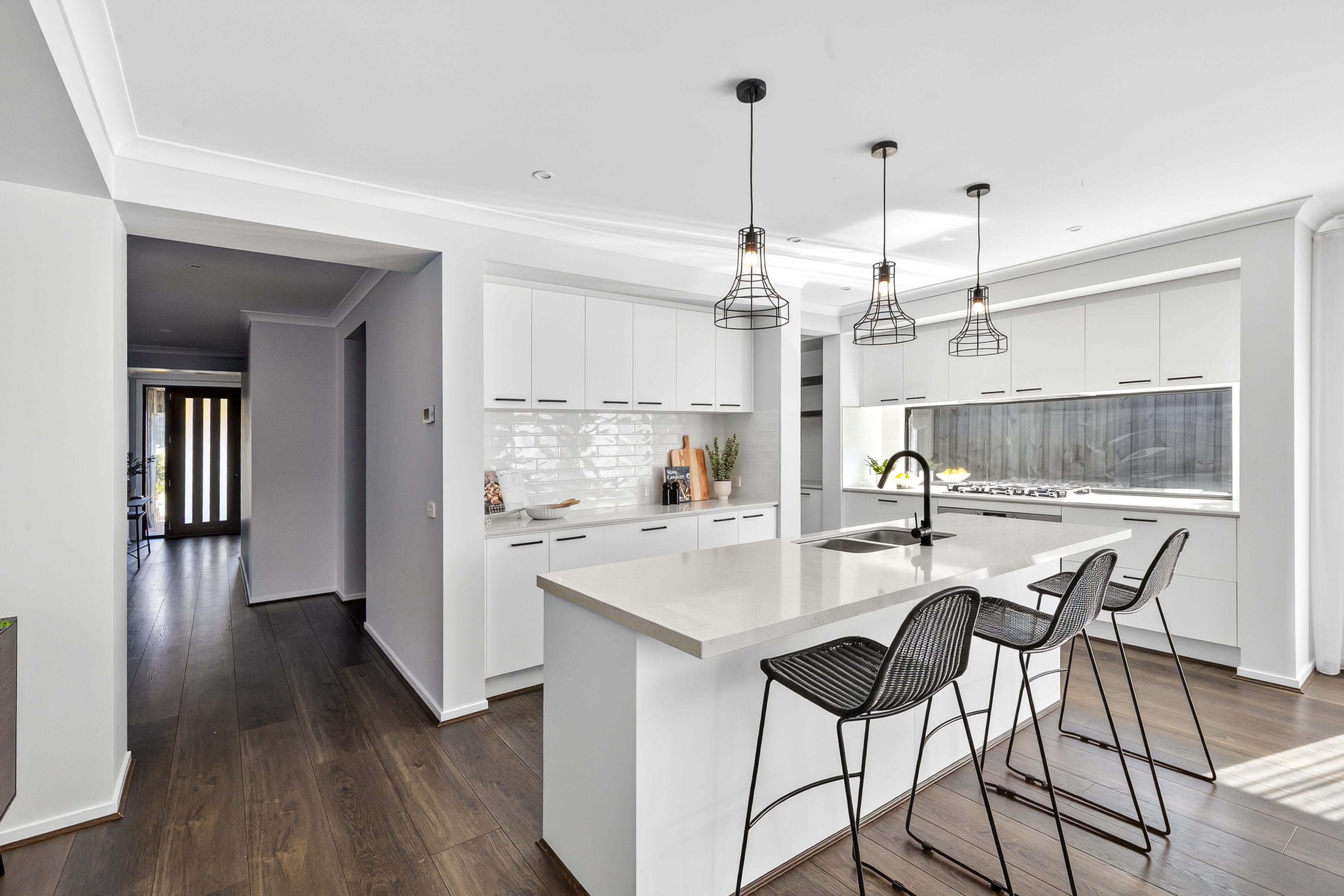 Kitchen – The heart of the home, cater in style with a sleek 40mm stone breakfast bench bar, abundance of bench space, elegant pendant lighting, practical pot drawers, a 900mm oven and stove, built-in rangehood, overhead cabinetry, and a striking subway tile splashback. The superbly appointed dual entrance walk-in pantry features further bench space, extensive shelving and a spacious fridge cavity – perfect for the family.