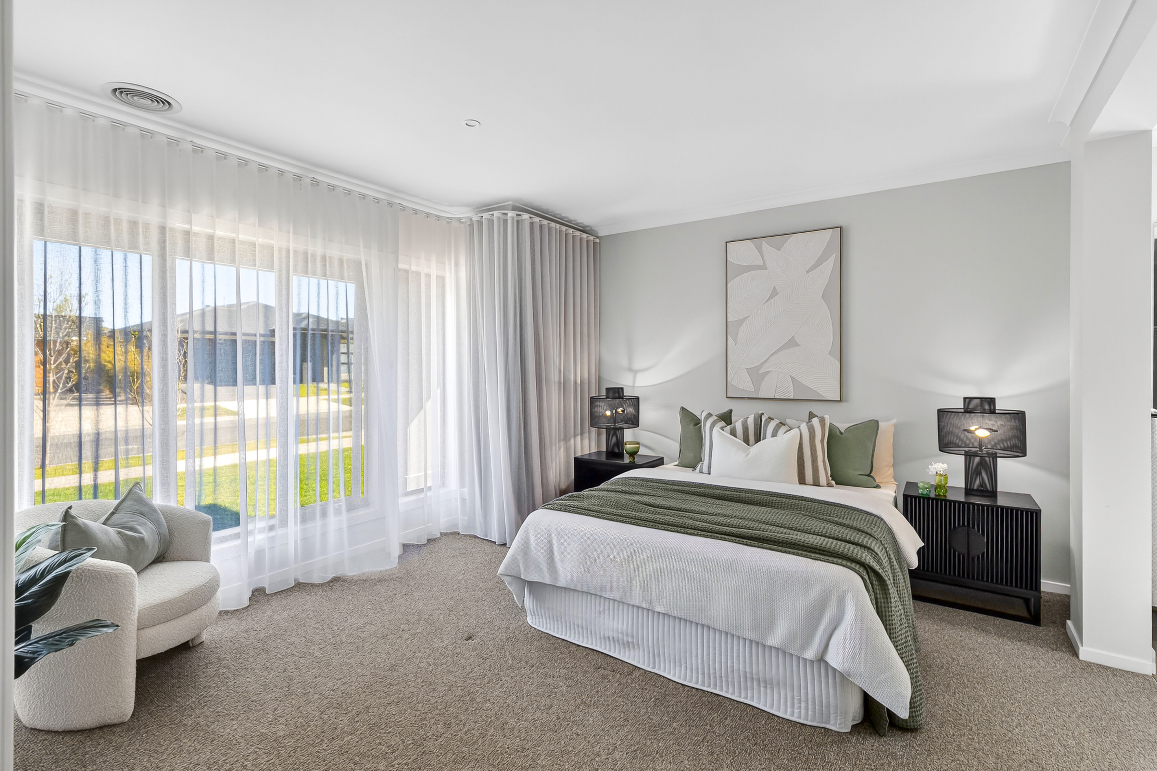 Master Suite – Retreat to a stylish master suite positioned at the front of the home, complete with plush carpet, sheer curtains paired with roller blinds, and ambient downlighting. A spacious walk-in robe adds practicality, while the luxe ensuite features an extended walk-in shower with a waterfall showerhead, matte black tapware, floor-to-ceiling tiles, an open toilet design, and a sleek double vanity with 20mm stone benchtop.