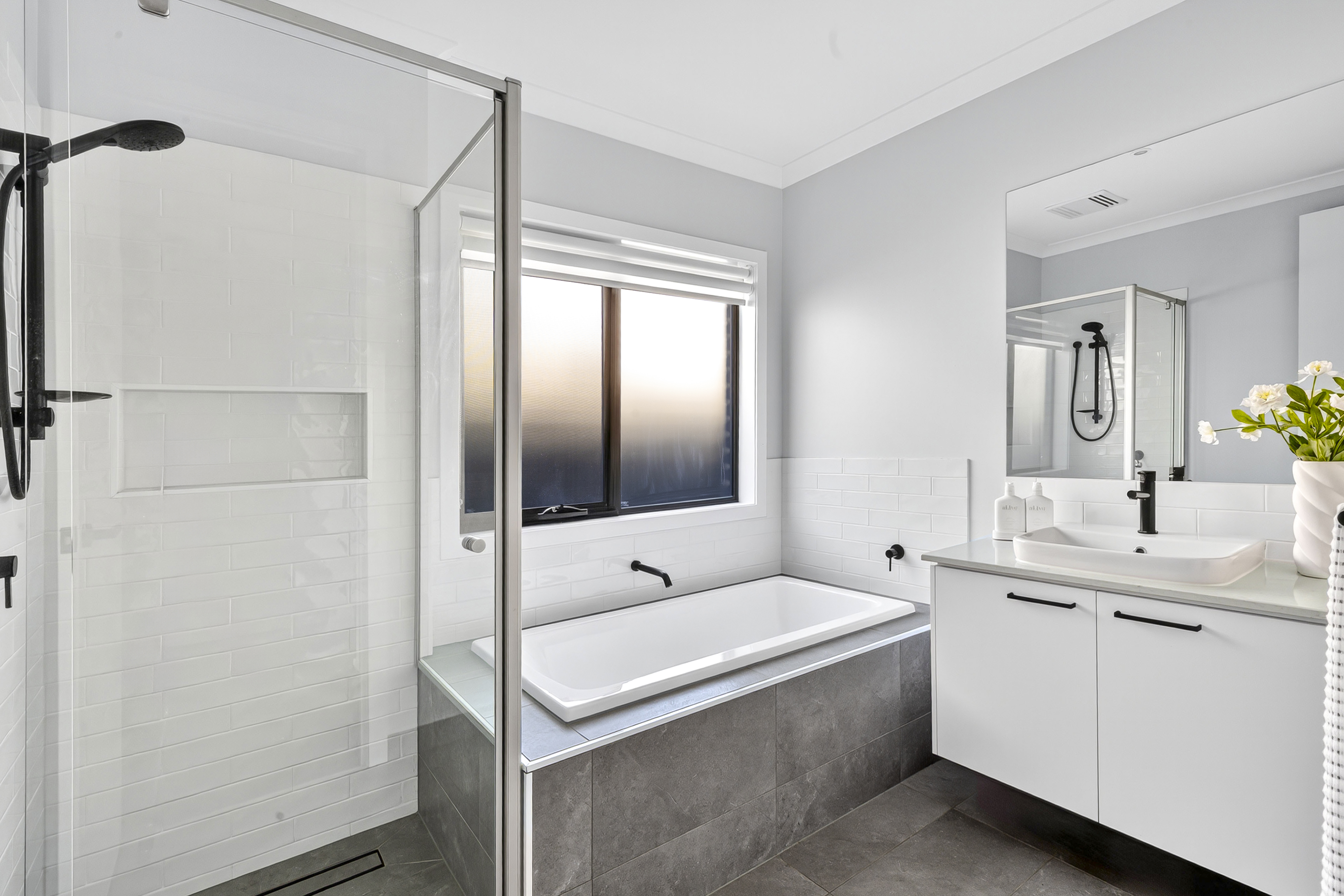 Main Bathroom – Stylish and highly functional, shower with built-in shower niche, bath, 20mm stone-topped single vanity, and matte black tapware for a touch of modern luxury.
