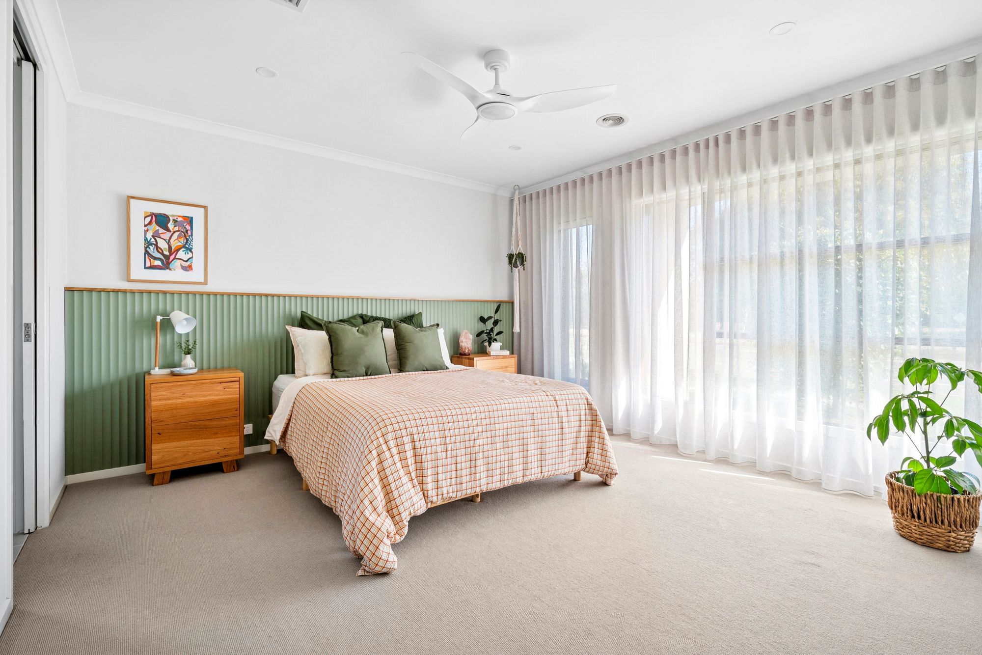 Master Suite: Generously sized and situated at the front of the home, it showcases a spacious walk-in robe and elegant ensuite. Complete with North-facing accoustic glazed windows and sheer curtains, downlights, VJ panelling feature wall, ducted heating and evaporative cooling, creating a comfortable space year-round. The gorgeous ensuite consists of a wall to wall shower with a handheld and wall-mounted showerhead, dual basin on a large 20mm stone vanity with mirrored splashbacks, private toilet, awning window with blockout blinds.