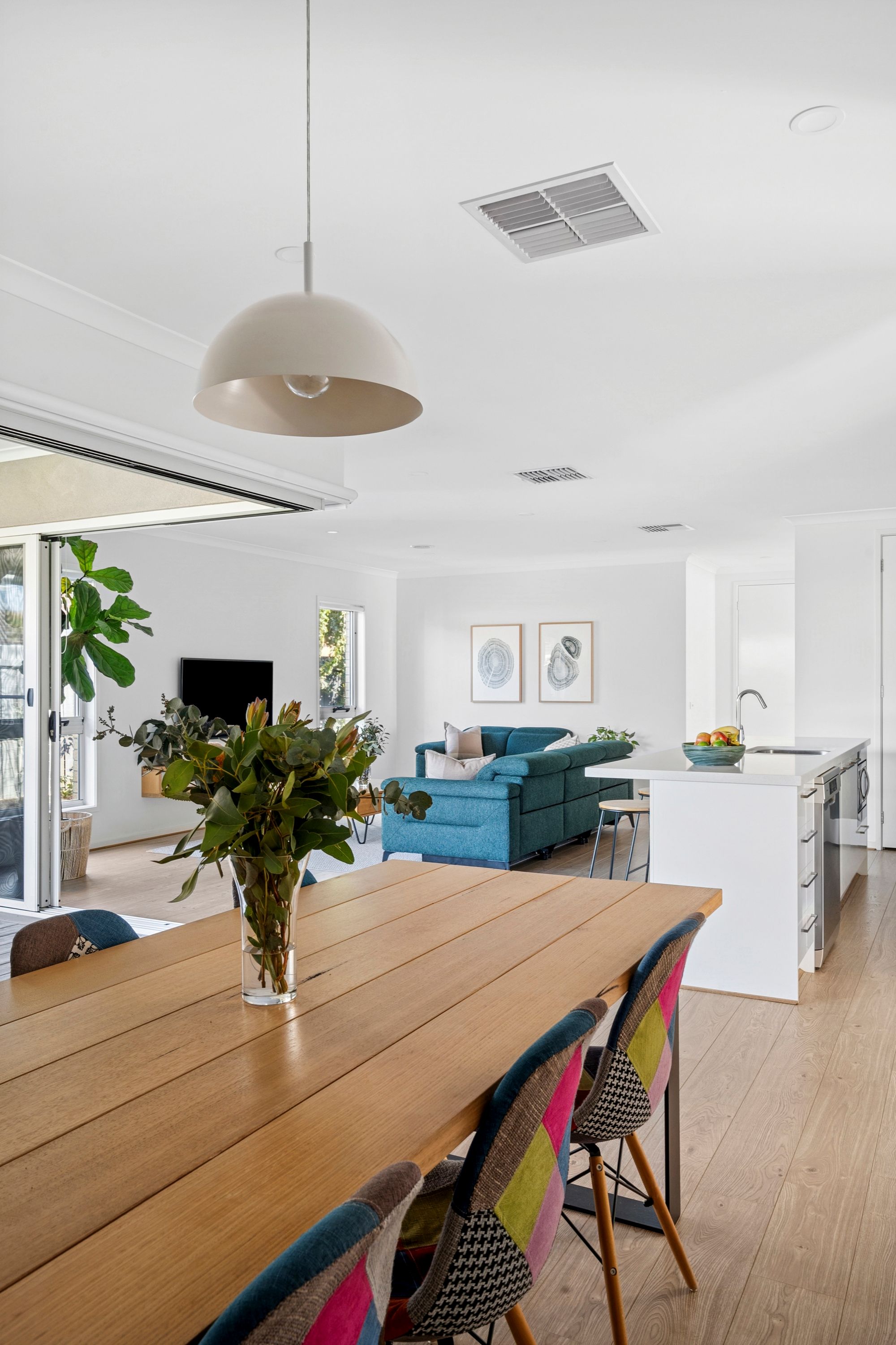 Open Plan Living/Dining: Ample natural light from the surrounding South and West facing double glazed windows and stacking glass sliding doors leading out onto the decked and undercover outdoor entertainment area as well as grassed rear yard. Downlights, ducted heating and evaporative cooling.