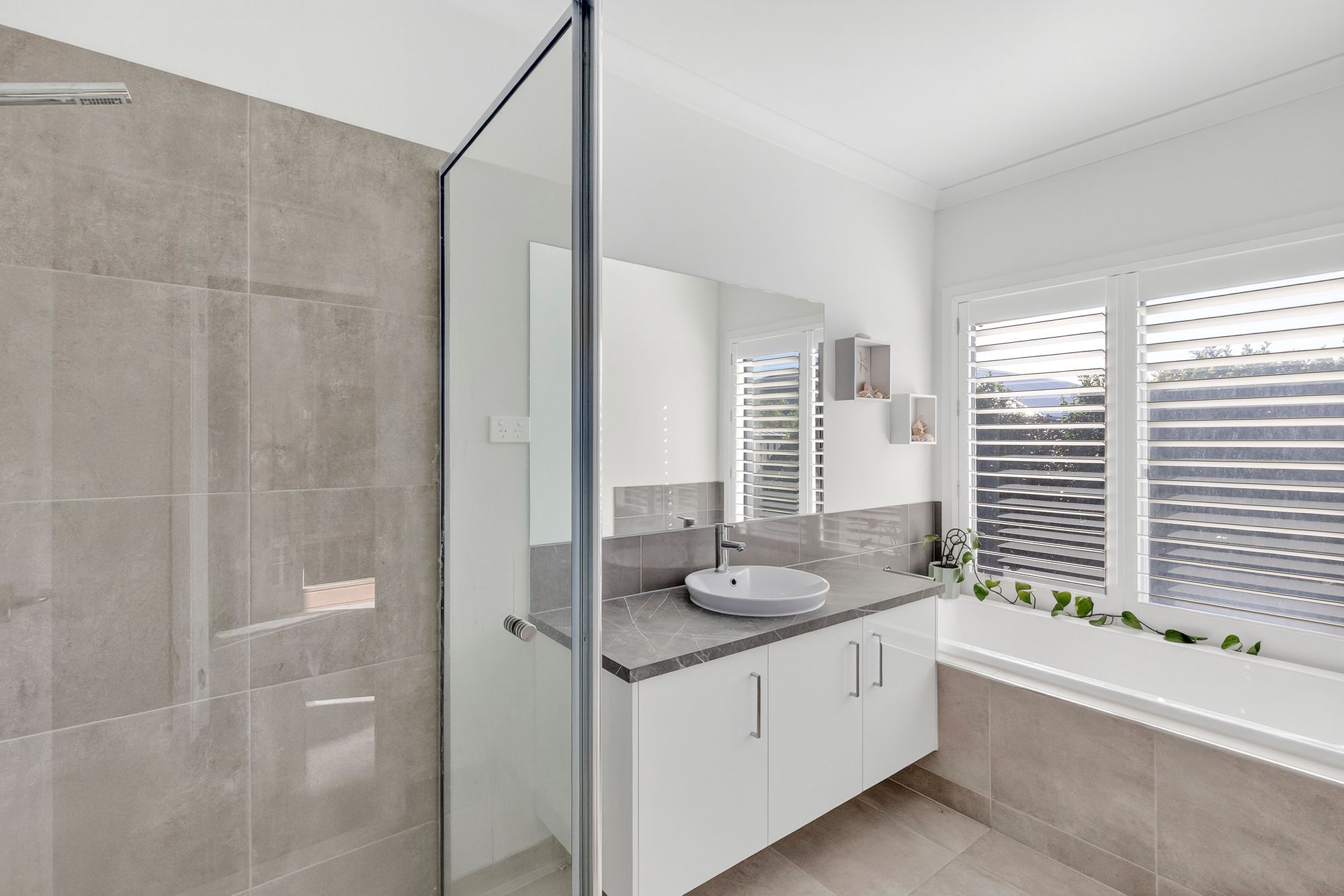 Additional Bathrooms: The main bathroom offers family functionality with style, featuring a single vanity with cabinetry, a raised bath, a large shower with handheld and wall-mounted showerheads, and a separate toilet. Plantation shutters, a mirrored tiled splashback, and modern finishes add a refined touch.