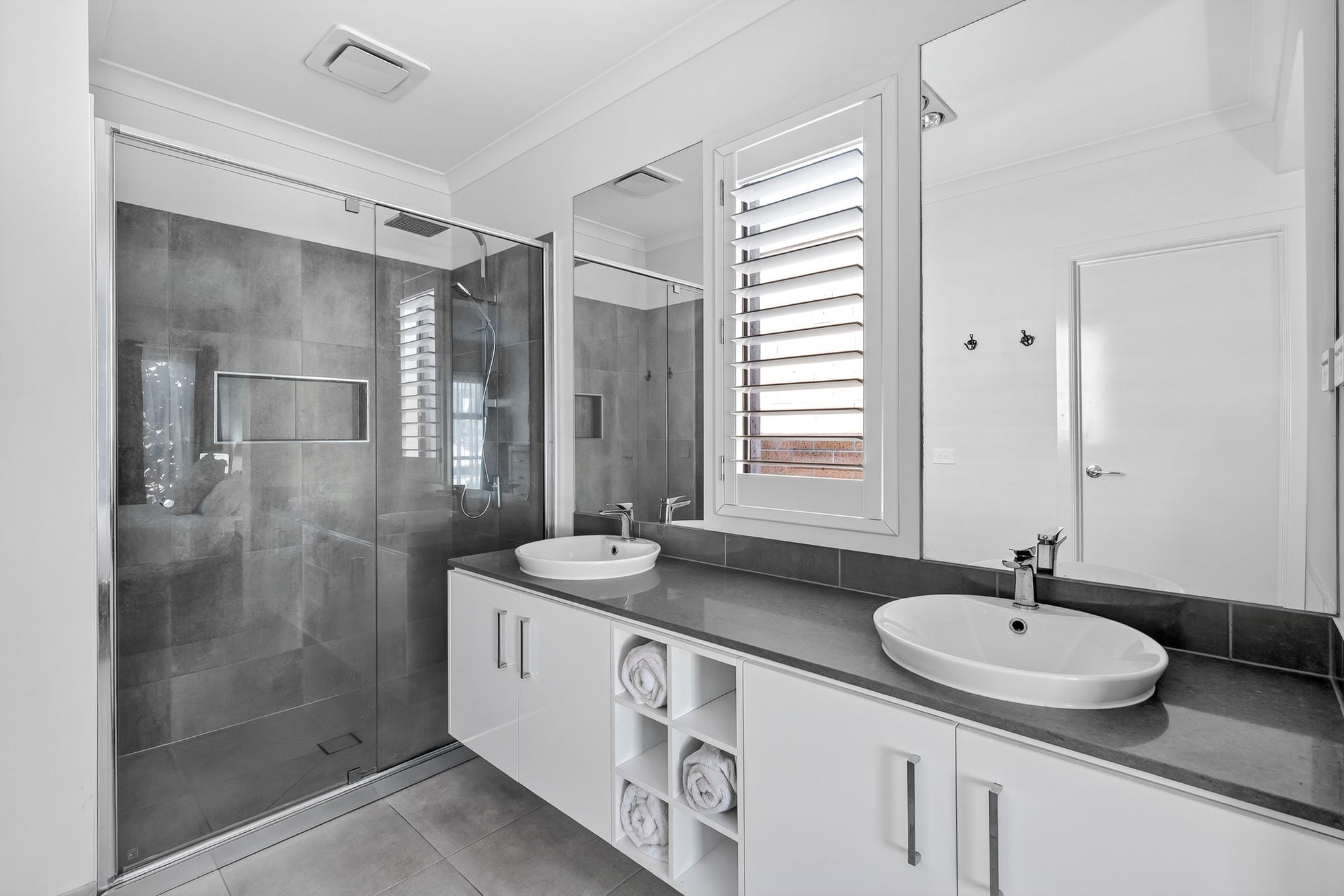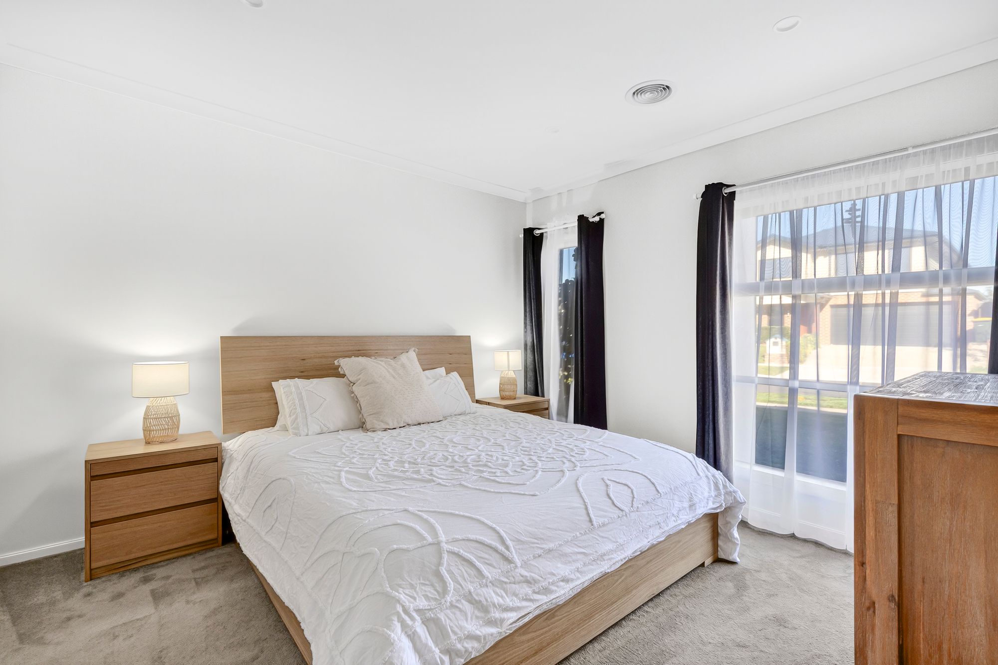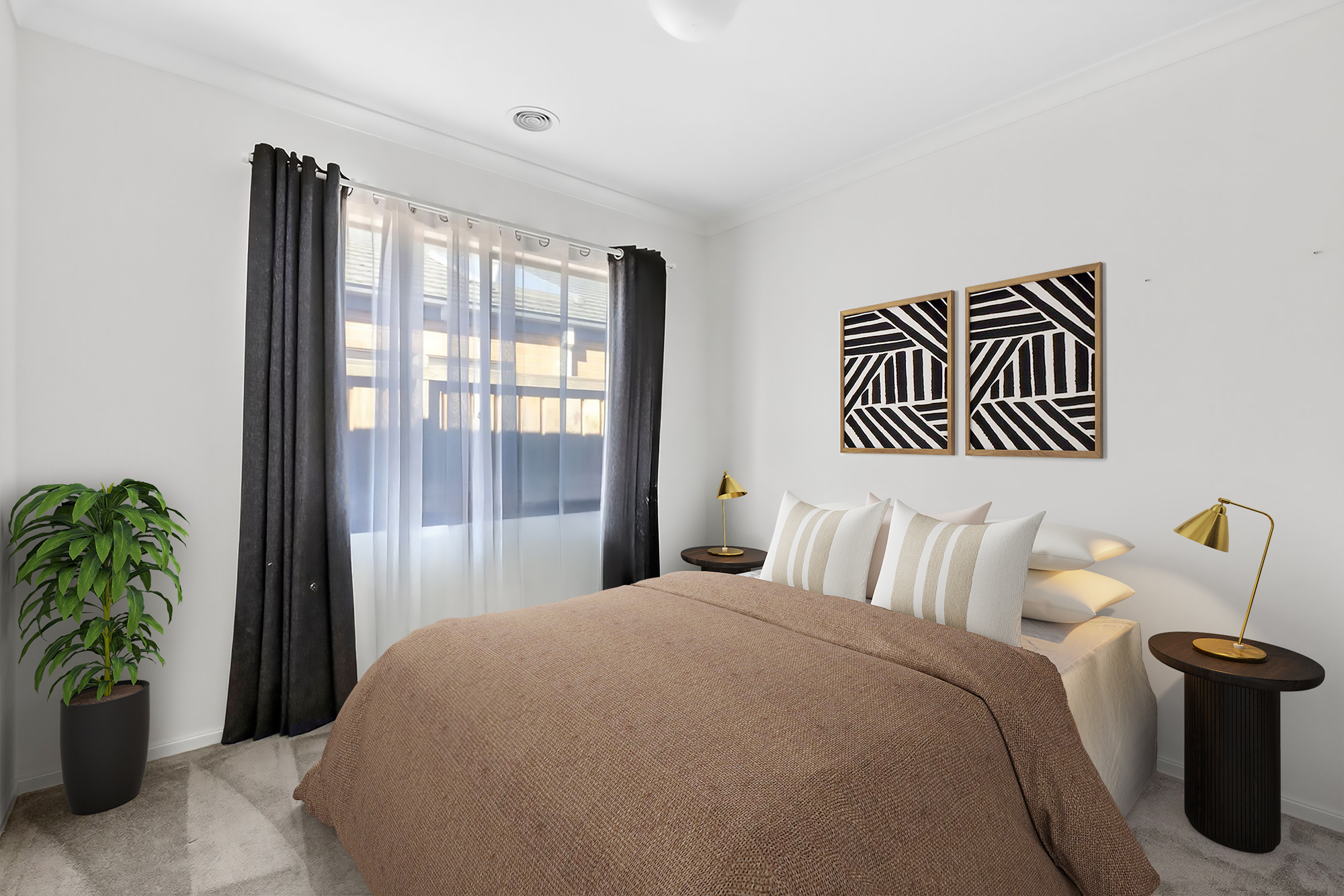 Master Suite: Positioned at the front of the home, the master suite is a serene escape. Featuring soft carpet underfoot, wide windows with both sheer and blockout curtains, and downlights throughout, it offers comfort and style in equal measure. The expansive walk-in robe provides generous storage, while the ensuite impresses with dual basins, 20mm stone benchtops, large vanity, and an oversized shower with both handheld and waterfall showerheads. A private toilet and plantation-shuttered window complete this refined space.