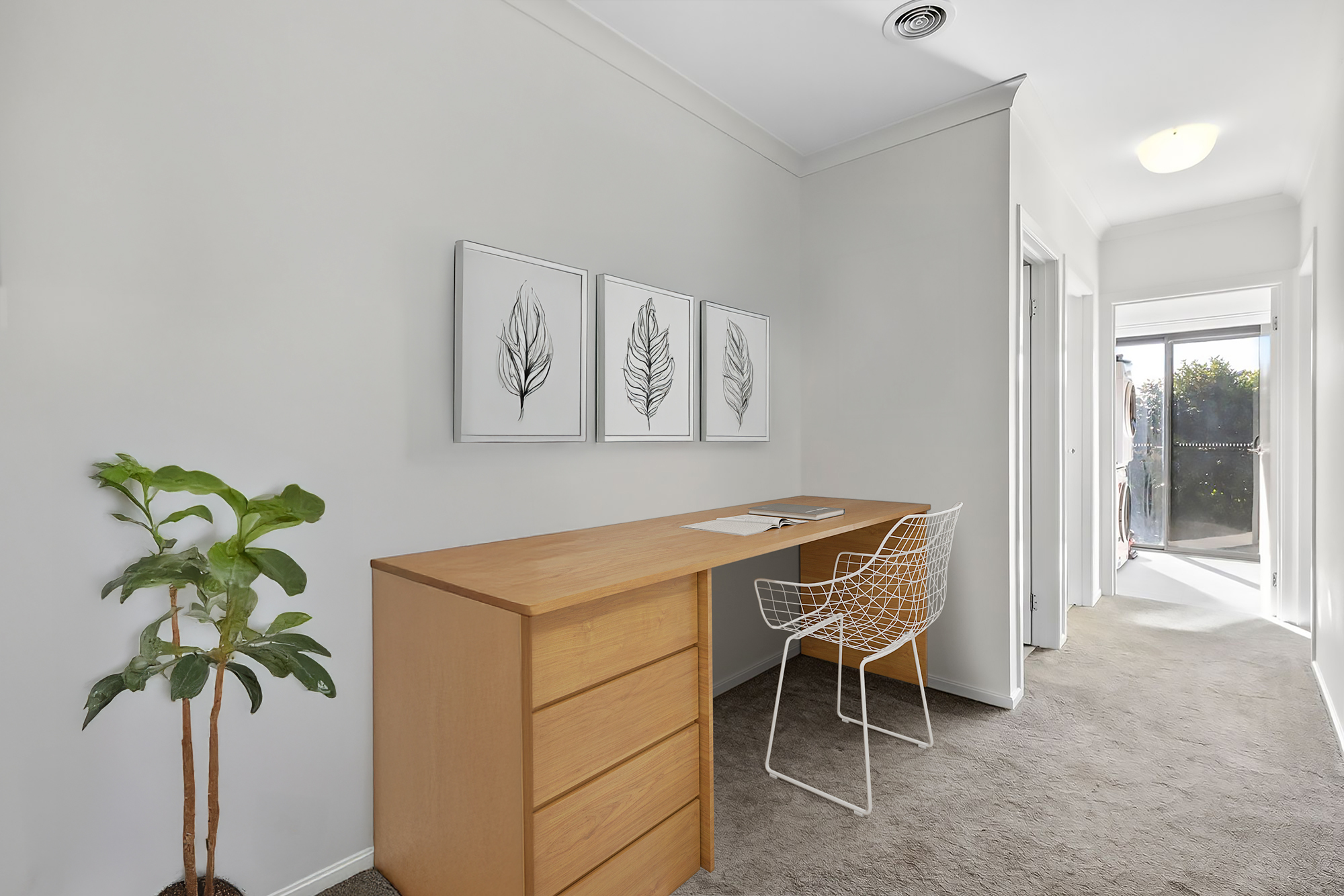 Additional Living Space: A second living area provides a private retreat ideal for movie nights or quiet relaxation. Complete with plush carpet, high ceilings, downlights, and a feature pendant, this room’s wide window with plantation shutters adds a touch of luxury and charm. Climate control is maintained with ducted heating and evaporative cooling. An additional cleverly designed study nook offers the perfect spot for working from home, studying, or managing daily tasks with ease and privacy.