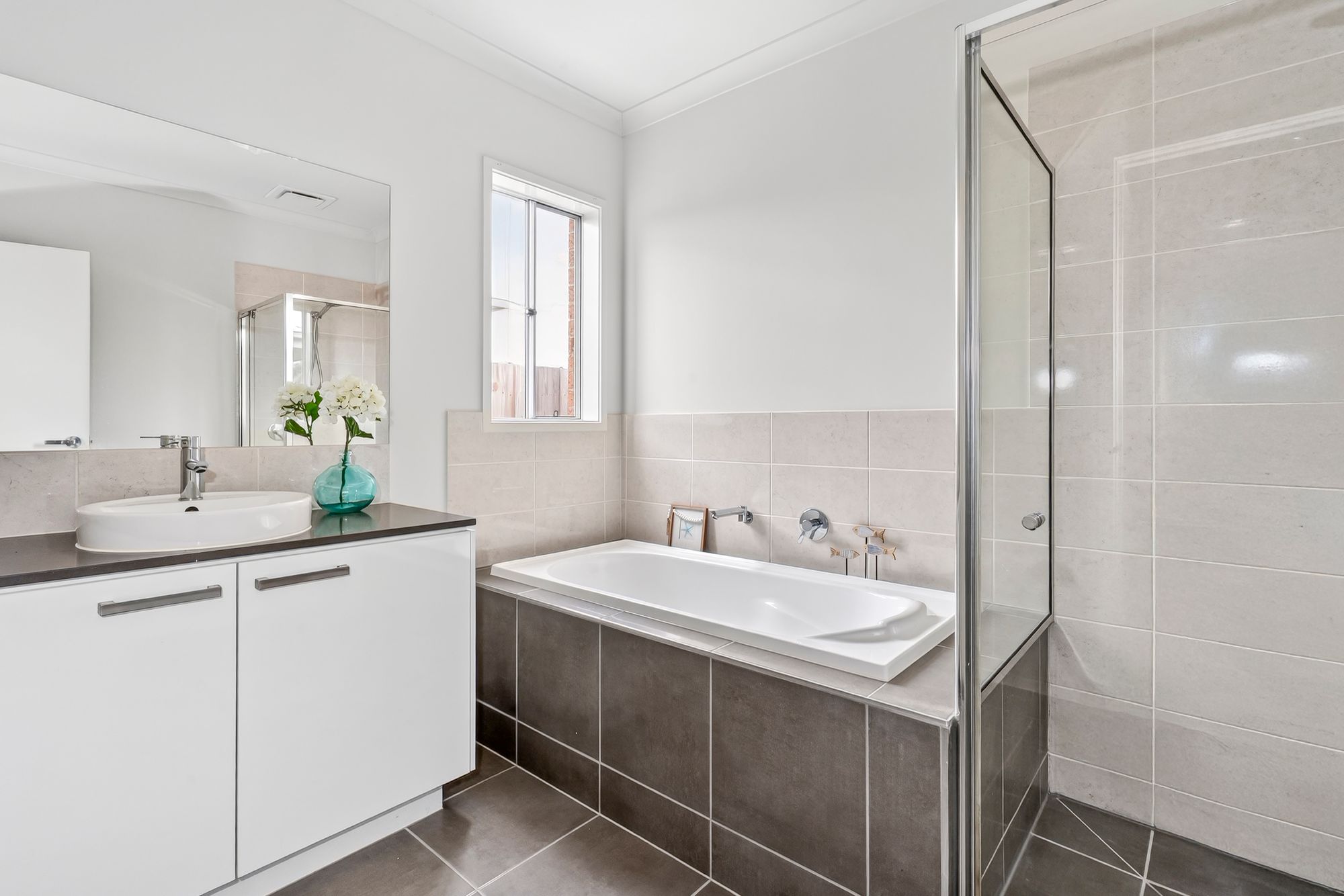 Main bathroom: Single shower with bath, 20mm stone benchtop with a single vanity, frameless mirror, tiles throughout