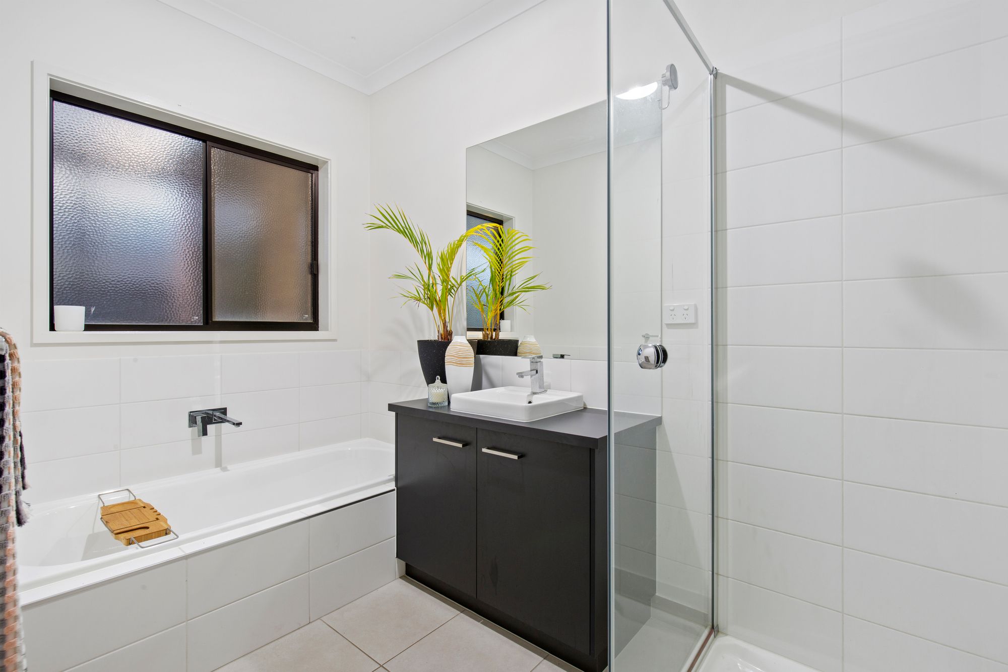 Main bathroom: Waterfall shower head, frosted window, single basin & mirror vanity, semi frameless shower, shower niche, bath, separate toilet.