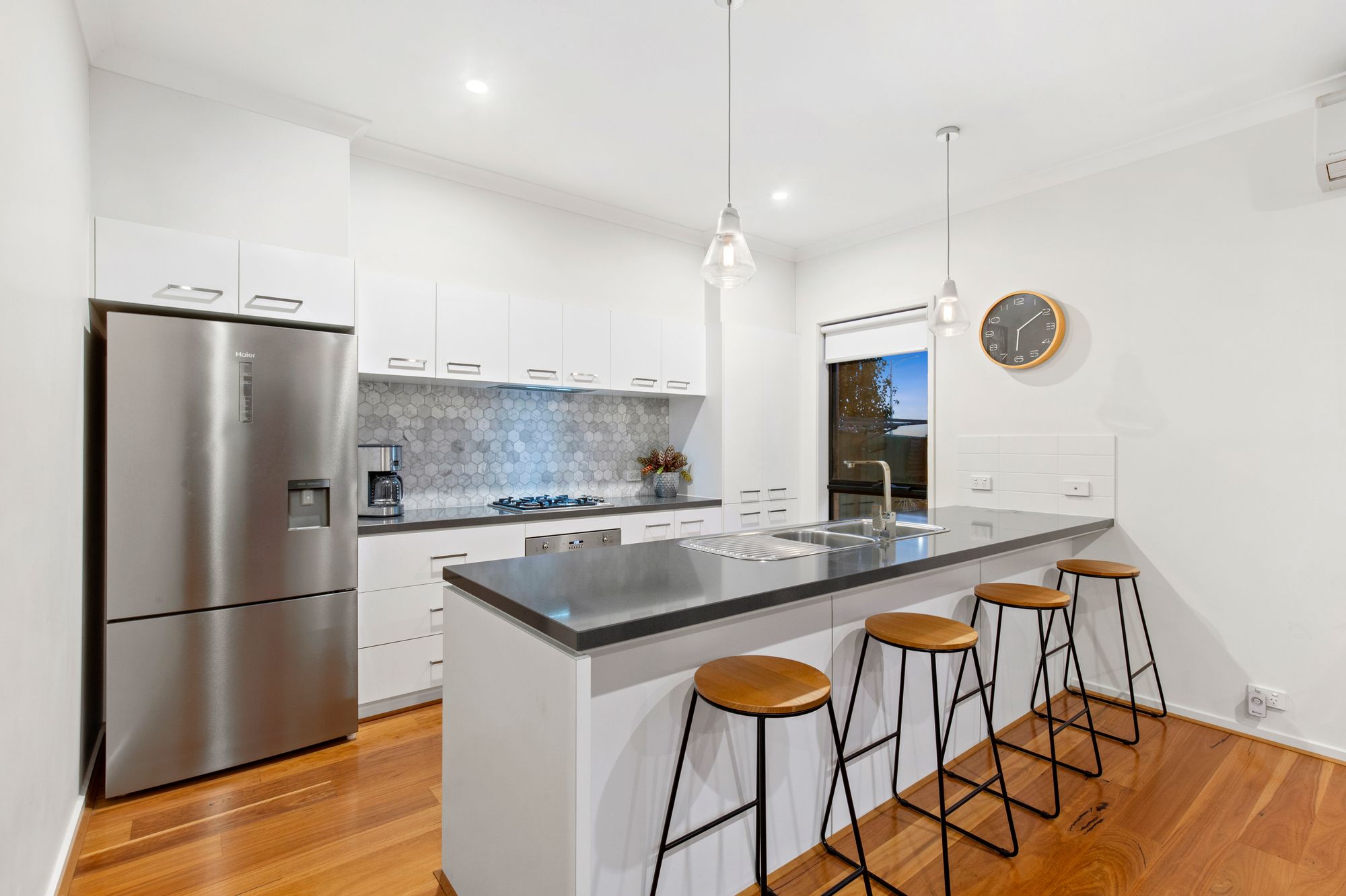 Kitchen: 40mm stone benchtops, breakfast bar overhang, geometric ‘beehive’ tile splashback, feature window, 600mm gas cooktop & oven, hidden rangehood, drawers, microwave provision, overhead cabinetry, dishwasher, plumbed refrigerator provision, built in pantry, overhead cabinetry, downlights, pendant lighting.