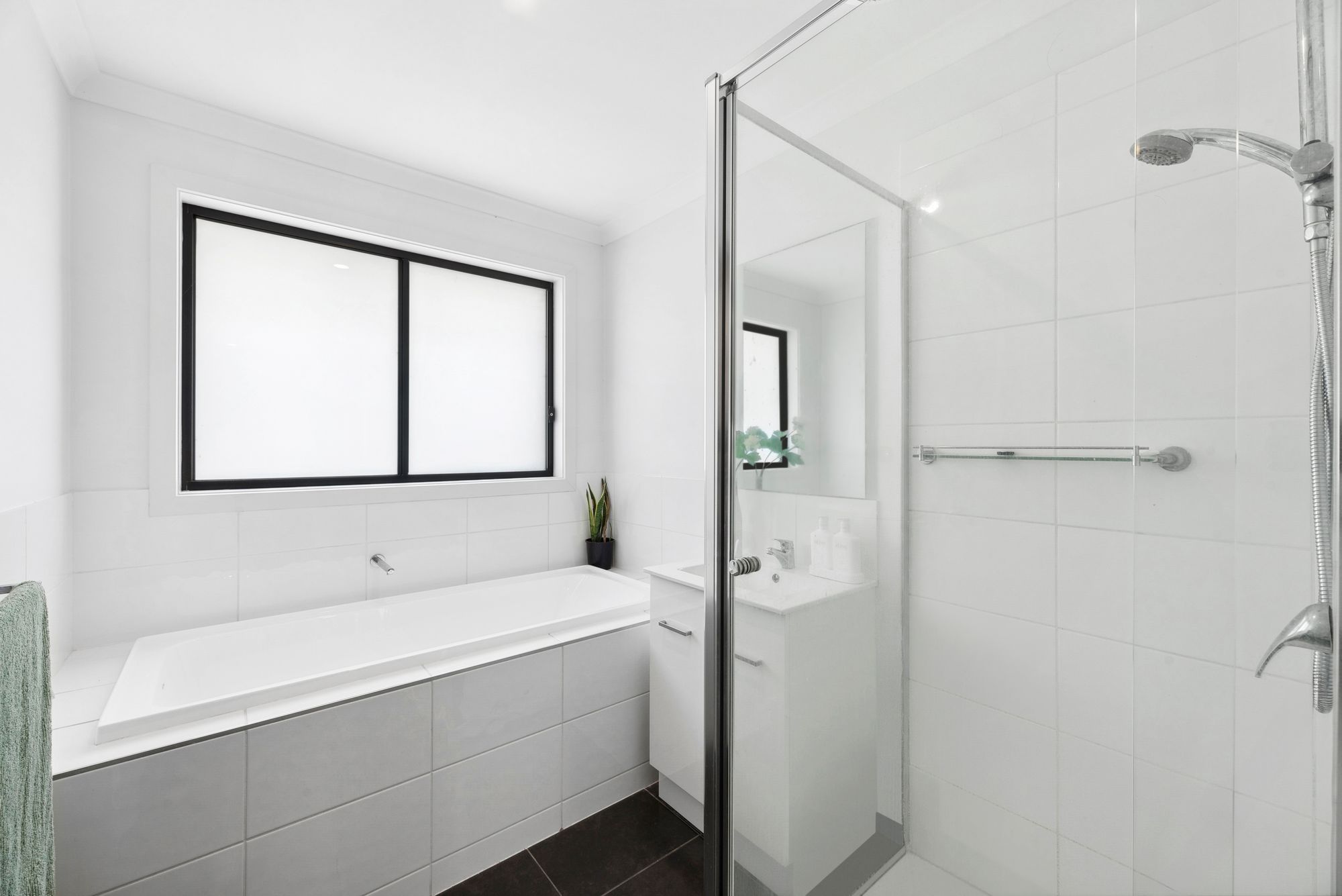 Main bathroom- tiles, bath, mirror splash back, semi frameless shower, storage, ceramic single basin and single vanity, separate toilet, fully tiled.