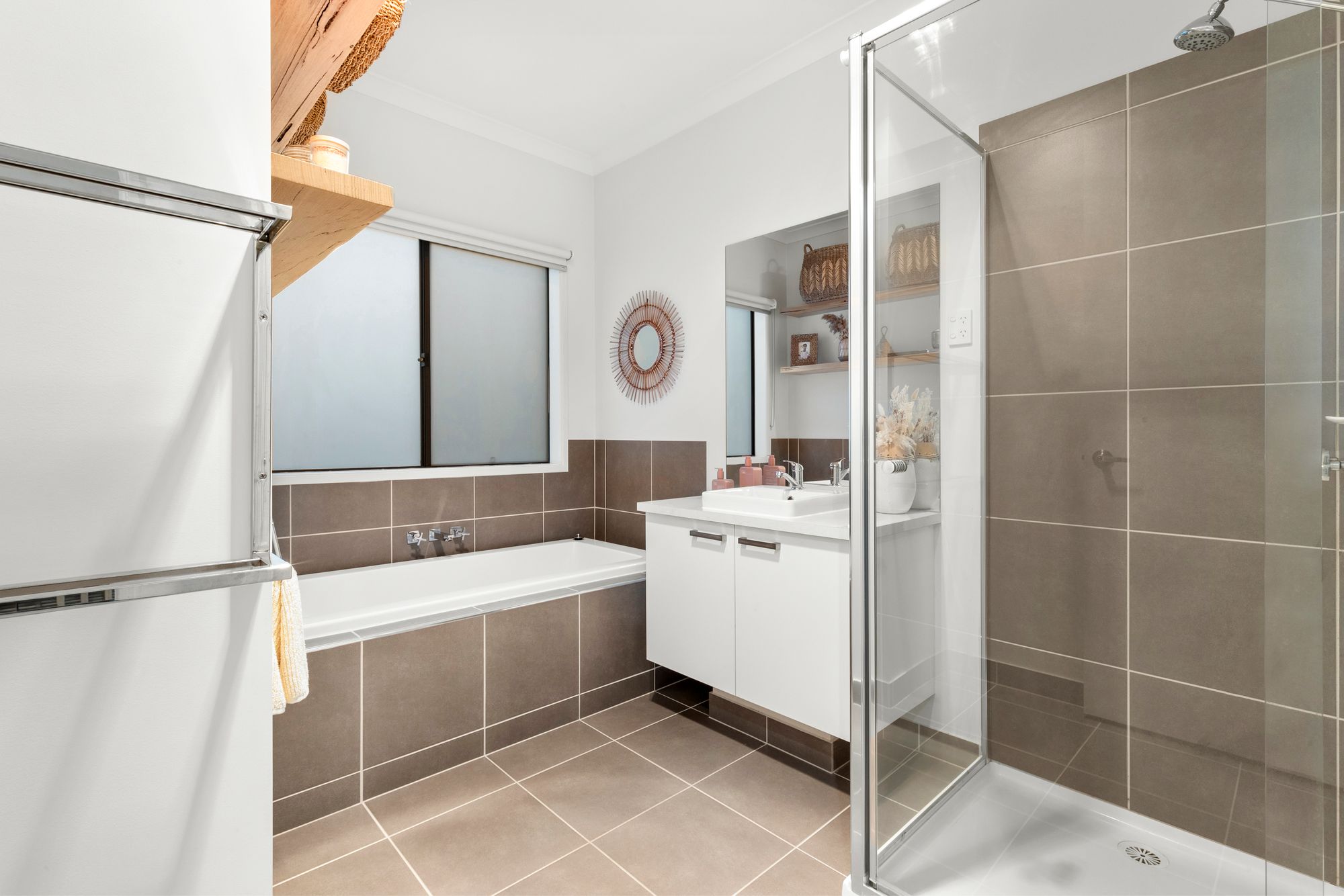 Main Bathroom – Shower, raised bath, single sink and vanity with 40mm stone-look benchtops, additional shelving and chrome fittings, frosted windows with roller blinds.