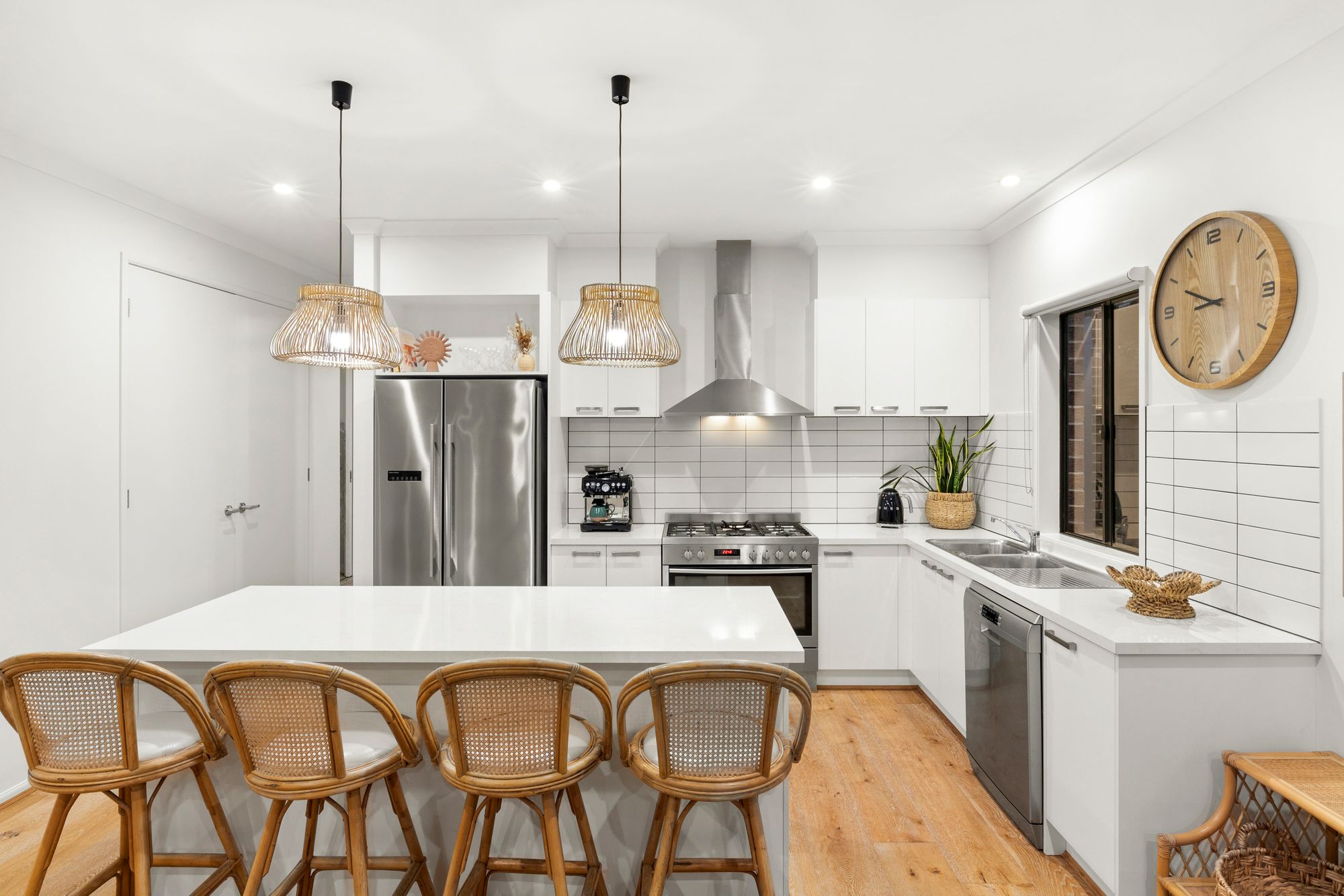 Kitchen – Open plan kitchen, 40mm stone-look benchtops throughout & island kitchen bench with breakfast bar overhang, chrome double-sink, pendant lighting & downlights, power points throughout, 900mm gas five-burner cooktop with range hood and oven, ducted heating, evaporative air-conditioning, built in pantry and tiled flooring.