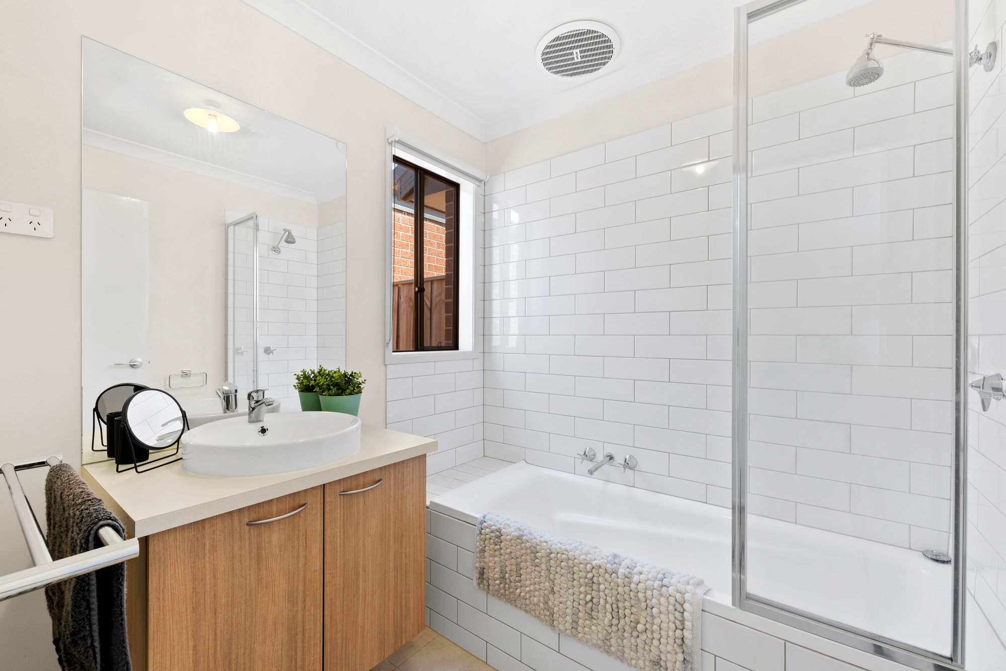 Main Bathroom: Downlights, single vanity, fully tiled shower, bathtub, and separate toilet.