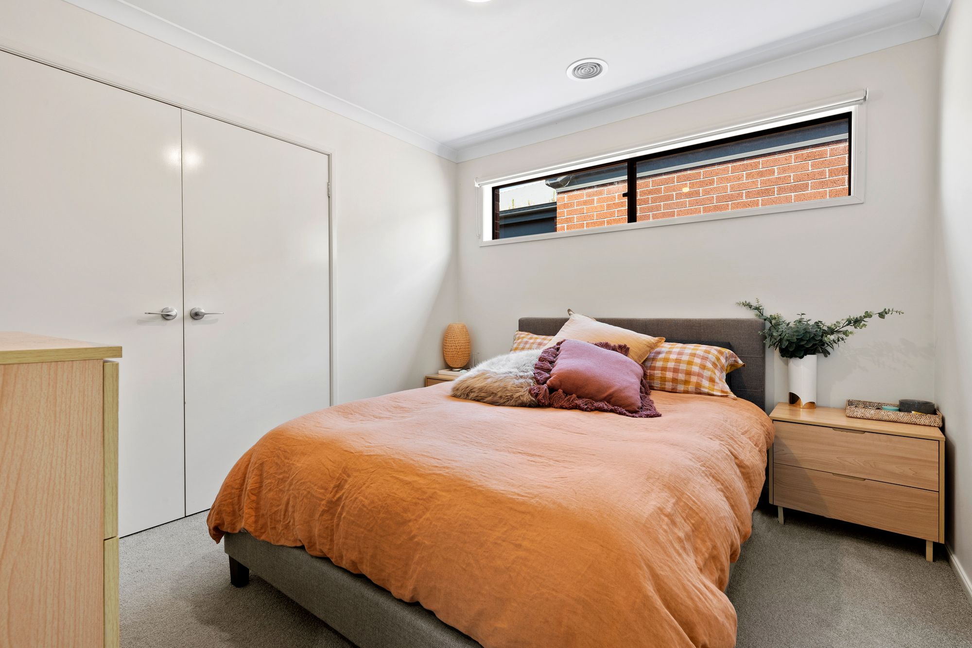 Master Bedroom: Carpeted with highlight window and roller blinds, downlights, ducted heating, and built-in robe.