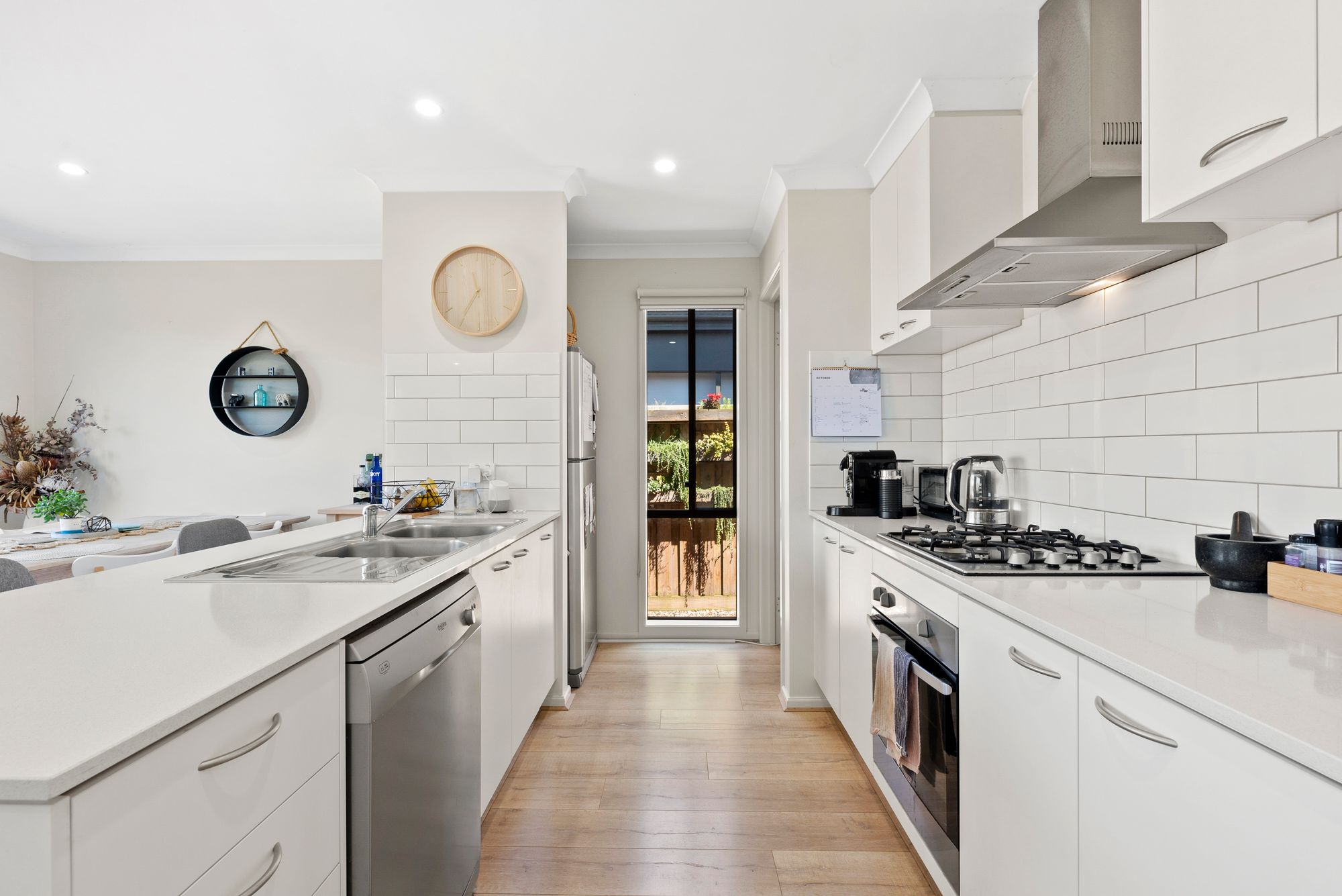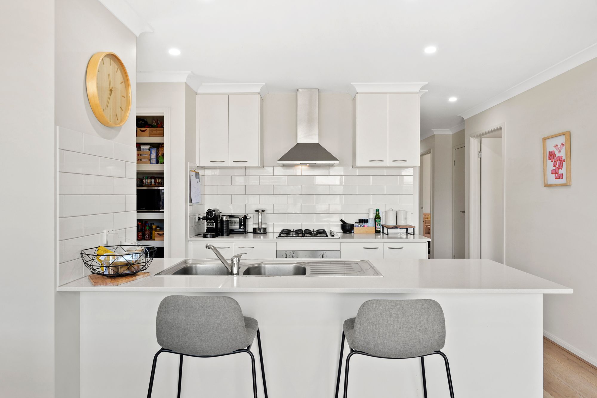 Kitchen: Spacious walk-in pantry, sleek tiled splashback, 600mm stainless steel appliances, 20mm stone benchtops, double sink, overhead cabinetry, downlights, timber-look laminate flooring, and dishwasher.