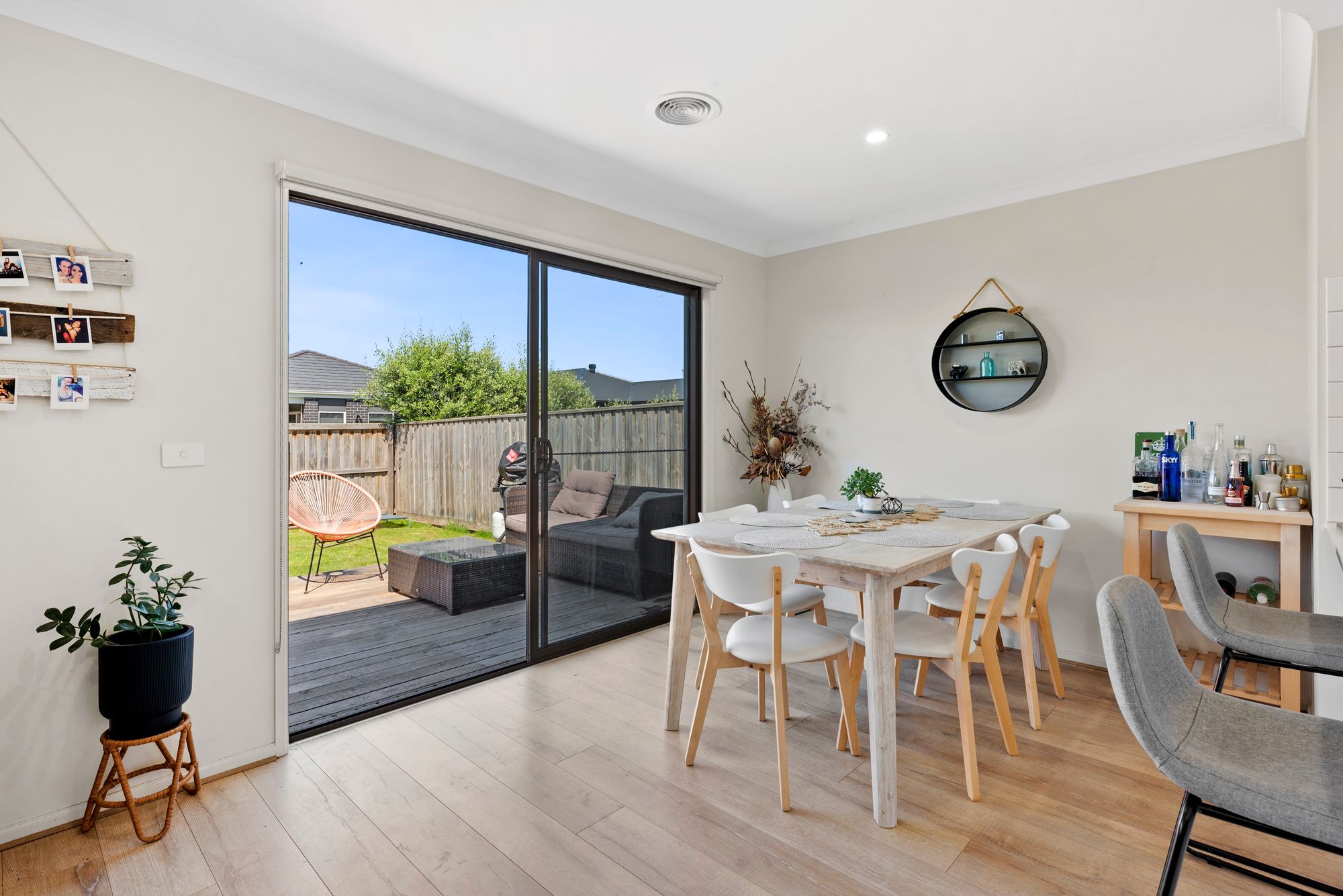 Living Area: Light-filled open-plan living and dining zone with downlights, timber-look laminate flooring, roller blinds, ducted heating, evaporative cooling, and sliding doors flowing out to the alfresco space.