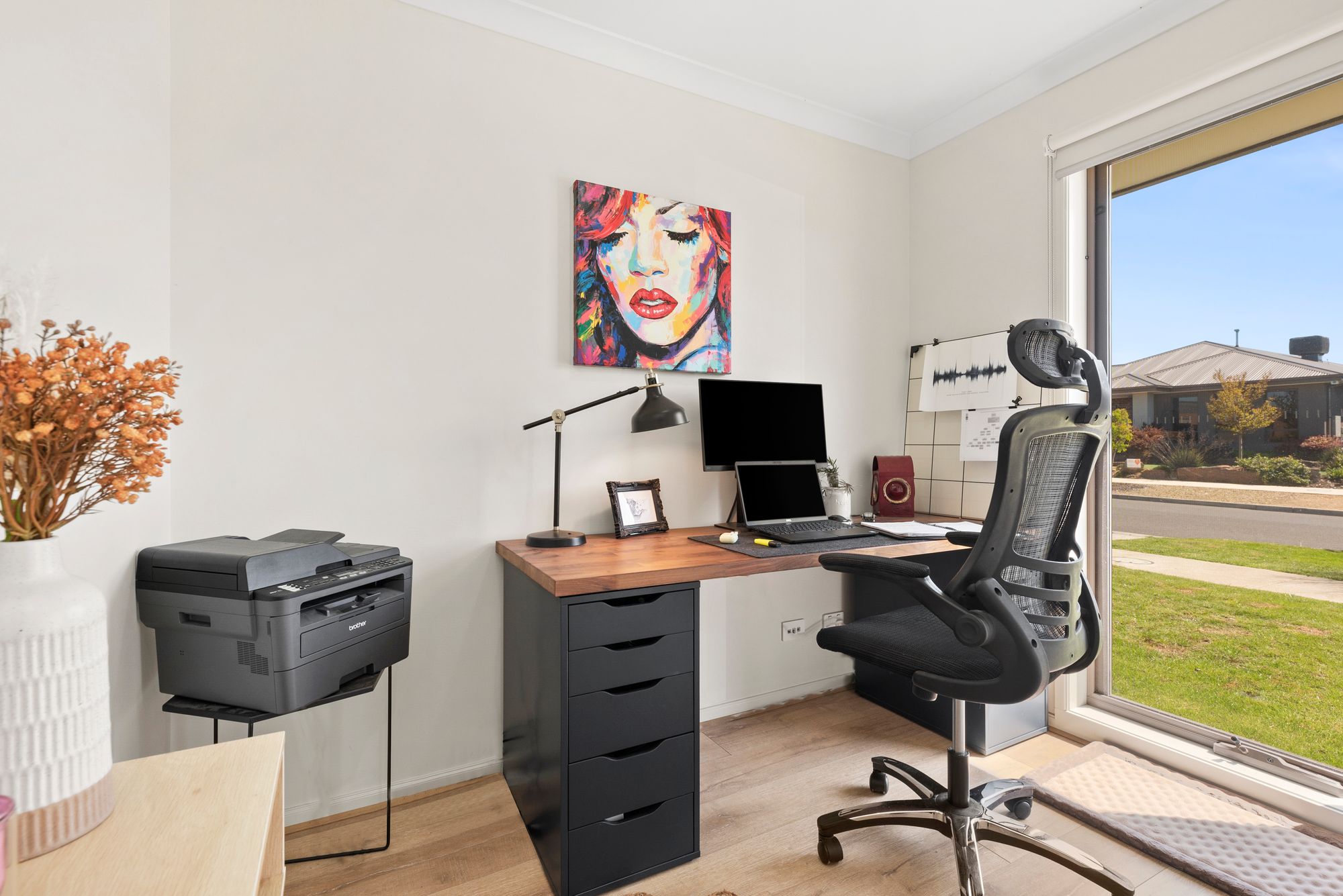 Study Nook: Semi-private with timber-look laminate flooring, roller-blind window, data points, and north-facing aspect for natural light.