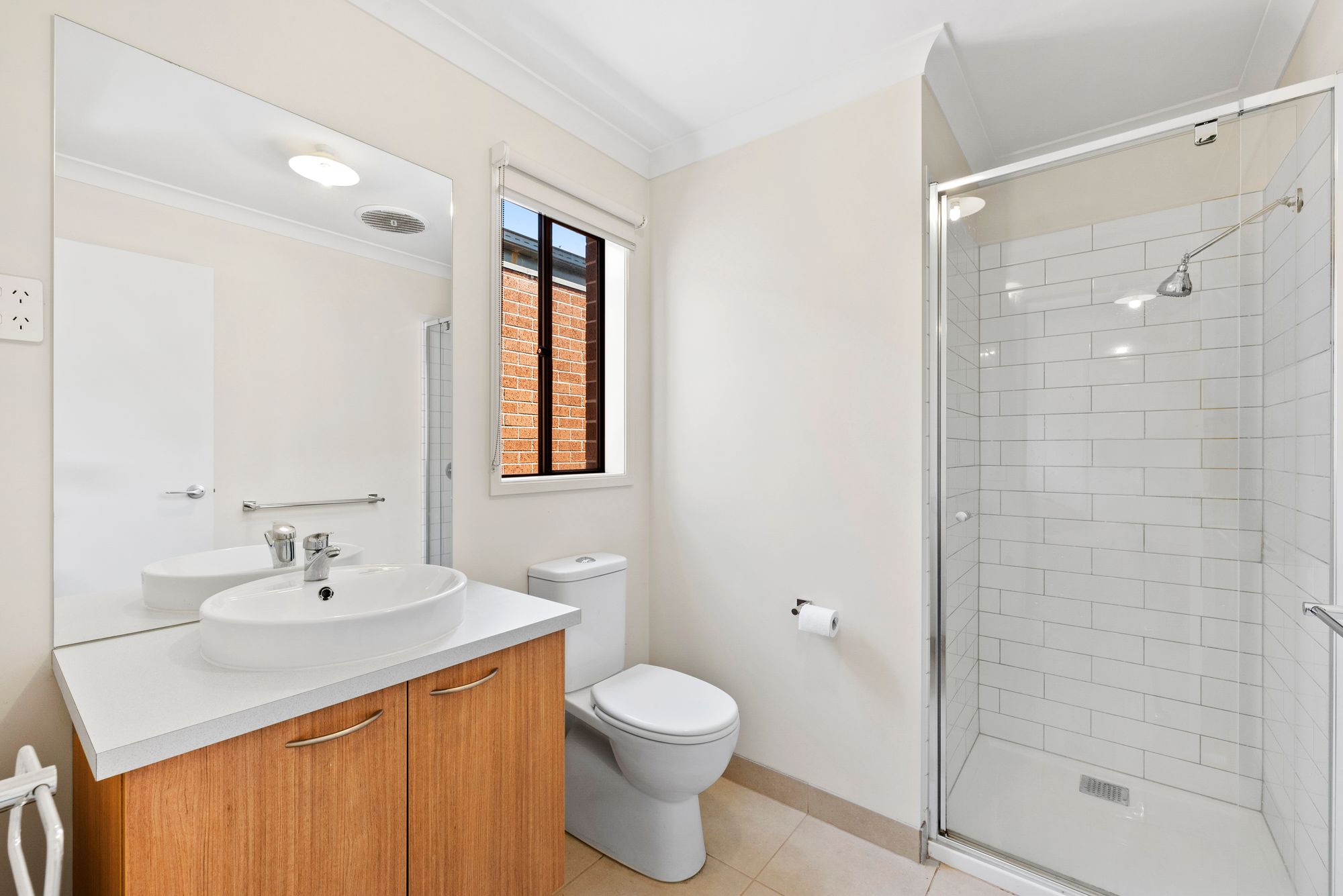 Ensuite: Single vanity and basin, hinge door for privacy, semi framless shower, mirror splashback and toilet
