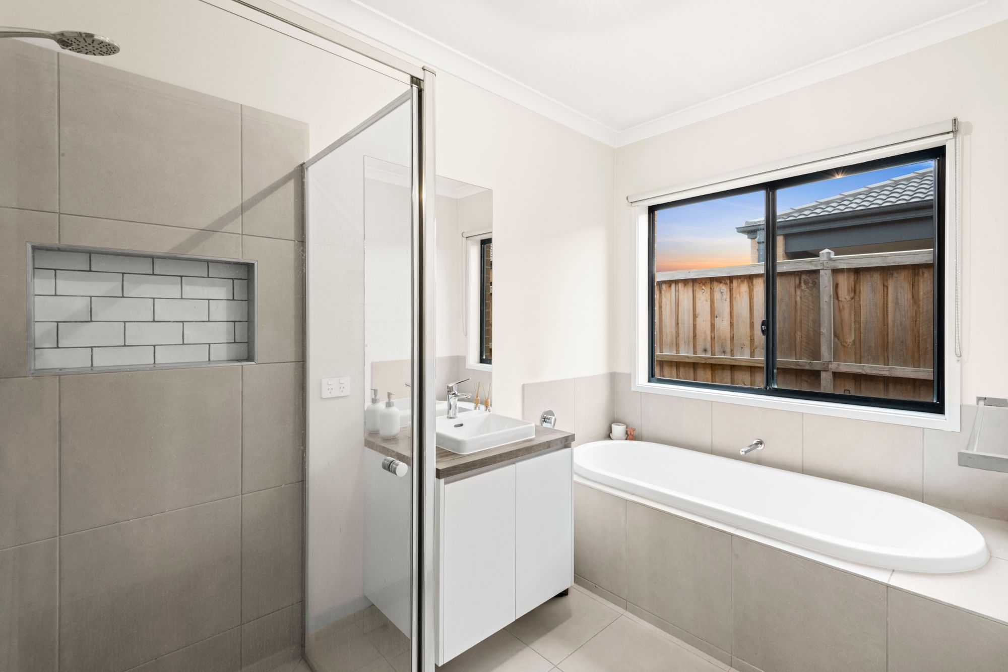 Main bathroom: Semi frameless shower, extended shower niche, bath, tiled floor, window with roller blinds, mirror splash back, single basin, stone benchtop, separate toilet