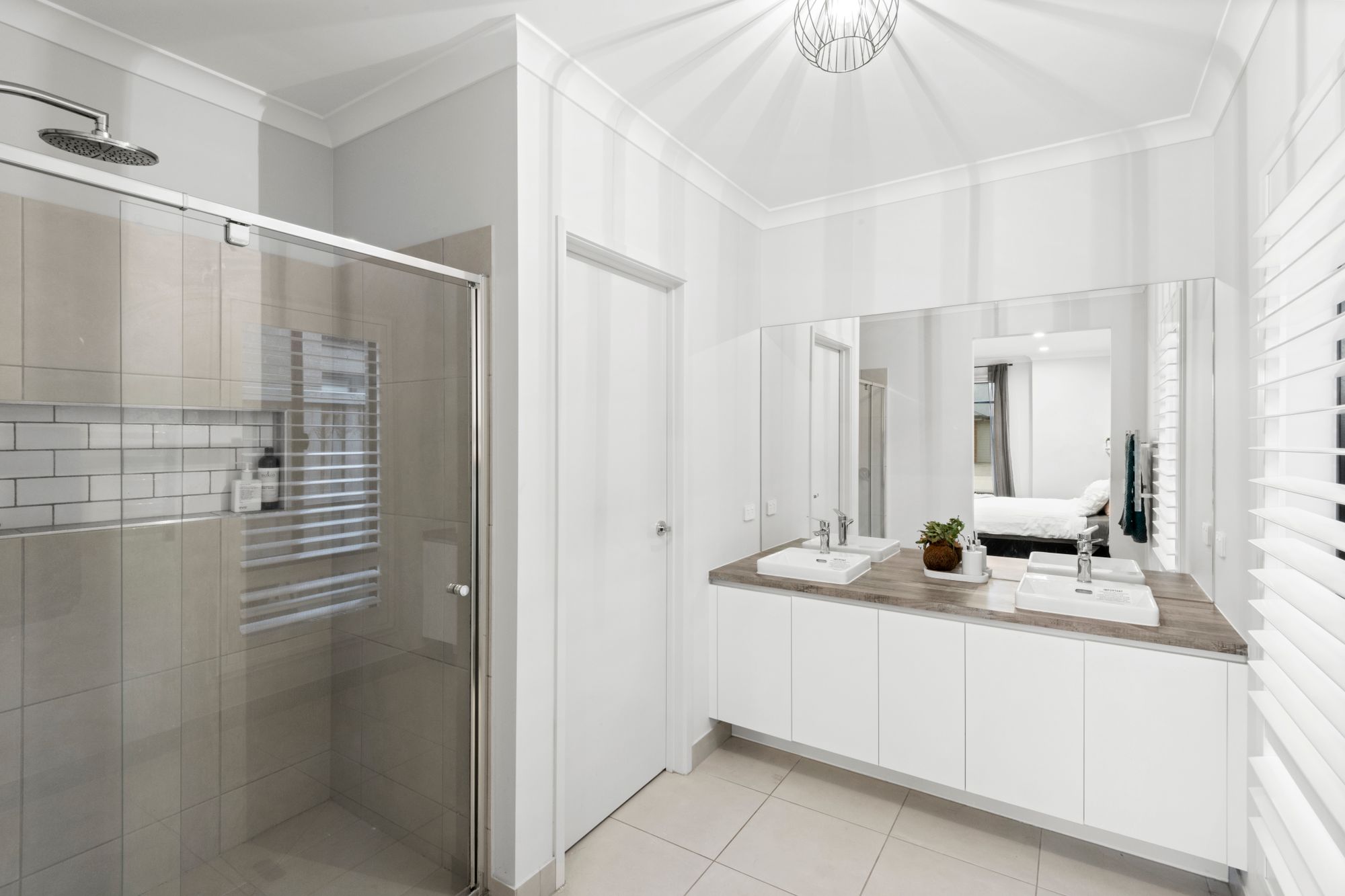 Master bedroom: Carpeted, ducted heating, windows with roller blinds and curtains, downlights, walk in robe with hanging rails, feature panelled wall. Ensuite: tiles, large mirror splash back, extended semi frameless shower, extended shower niche with subway tile, shutters, timber style benchtop, extended vanity and double basin, private toilet with door.